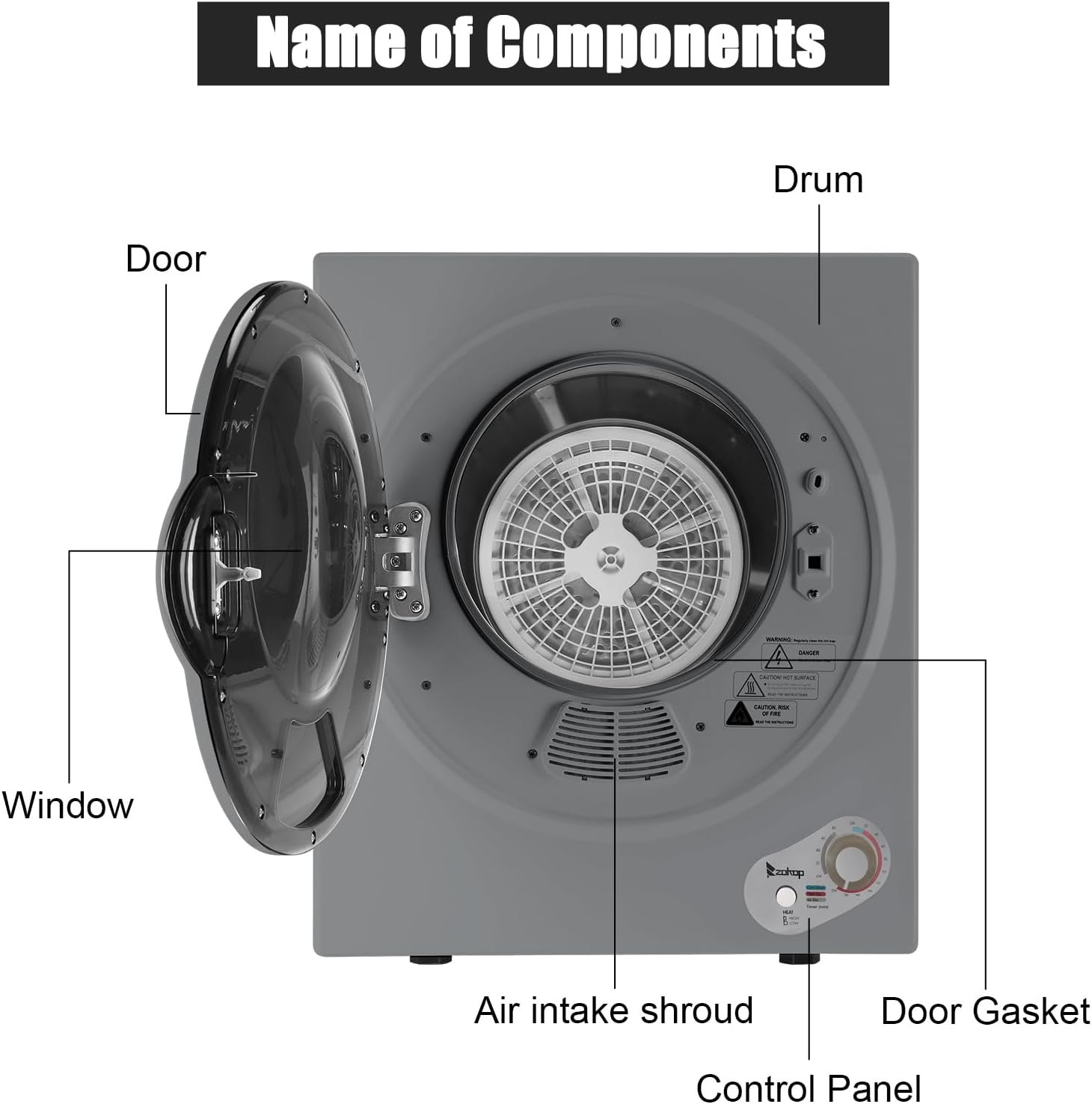 5. Material: ABS Control Panel, STS Drum,Plastic Door window