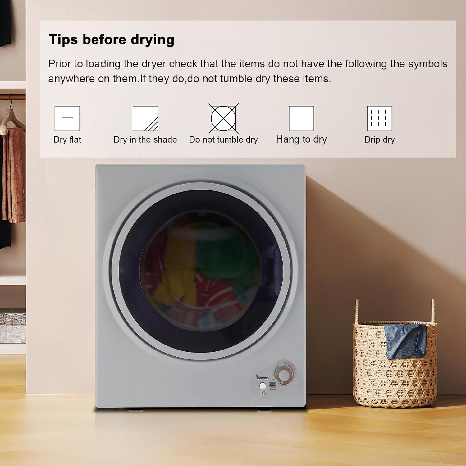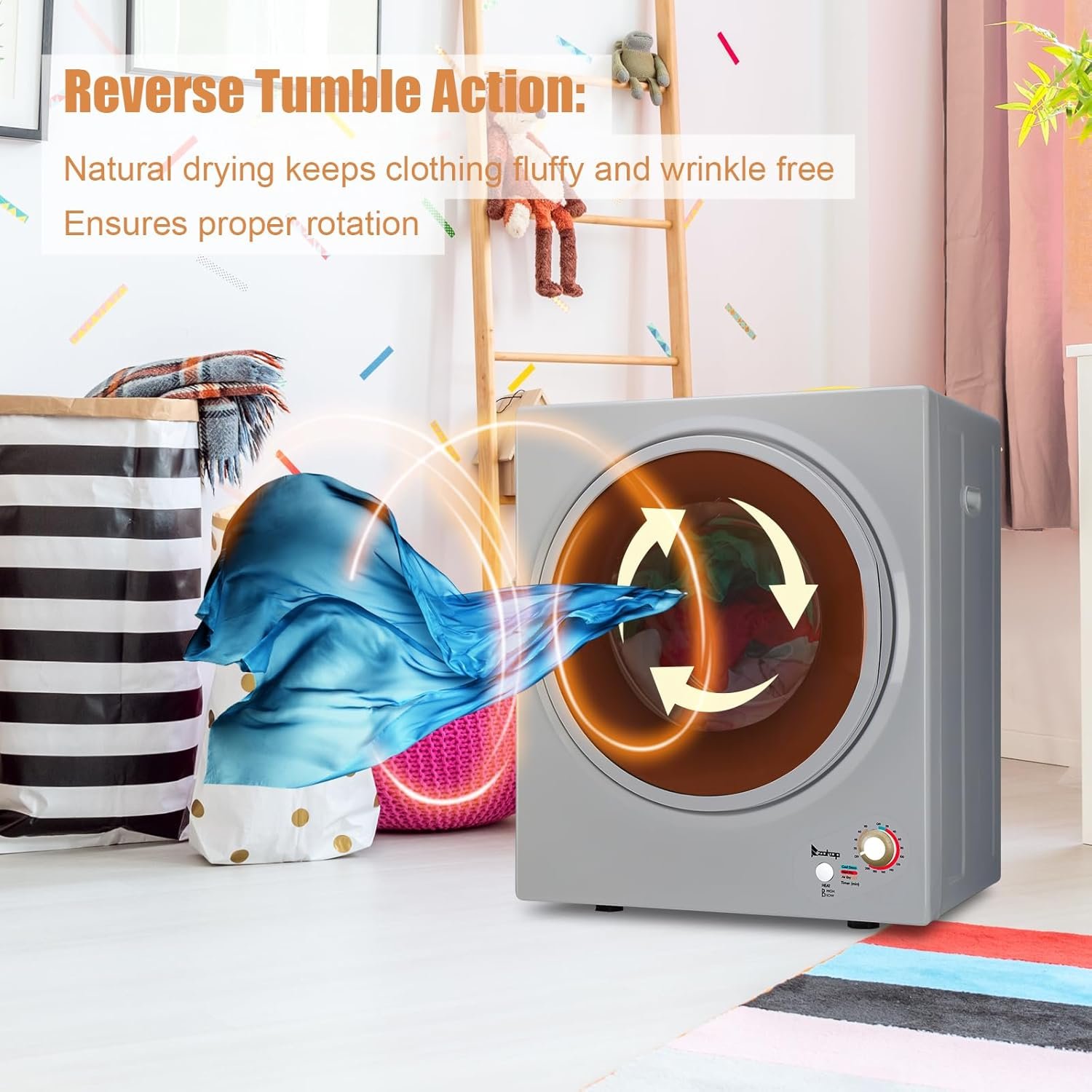 The clothes dryer adopts high-quality stainless steel roller design, and its internal physical structure is designed to make it more durable. The efficient rotation function can ensure your clothes to rotate fully, dry evenly and eliminate wrinkles, and achieve a fluffy and comfortable fit