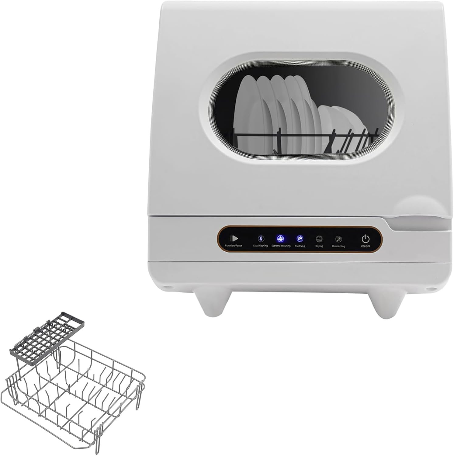 【Five Washing Programs】You’ll get full size dishwasher cleaning in a countertop sized compact unit that offers five wash programs – fast washing, strong washing, fruit and vegetable washing, self‑cleaning, and purification.