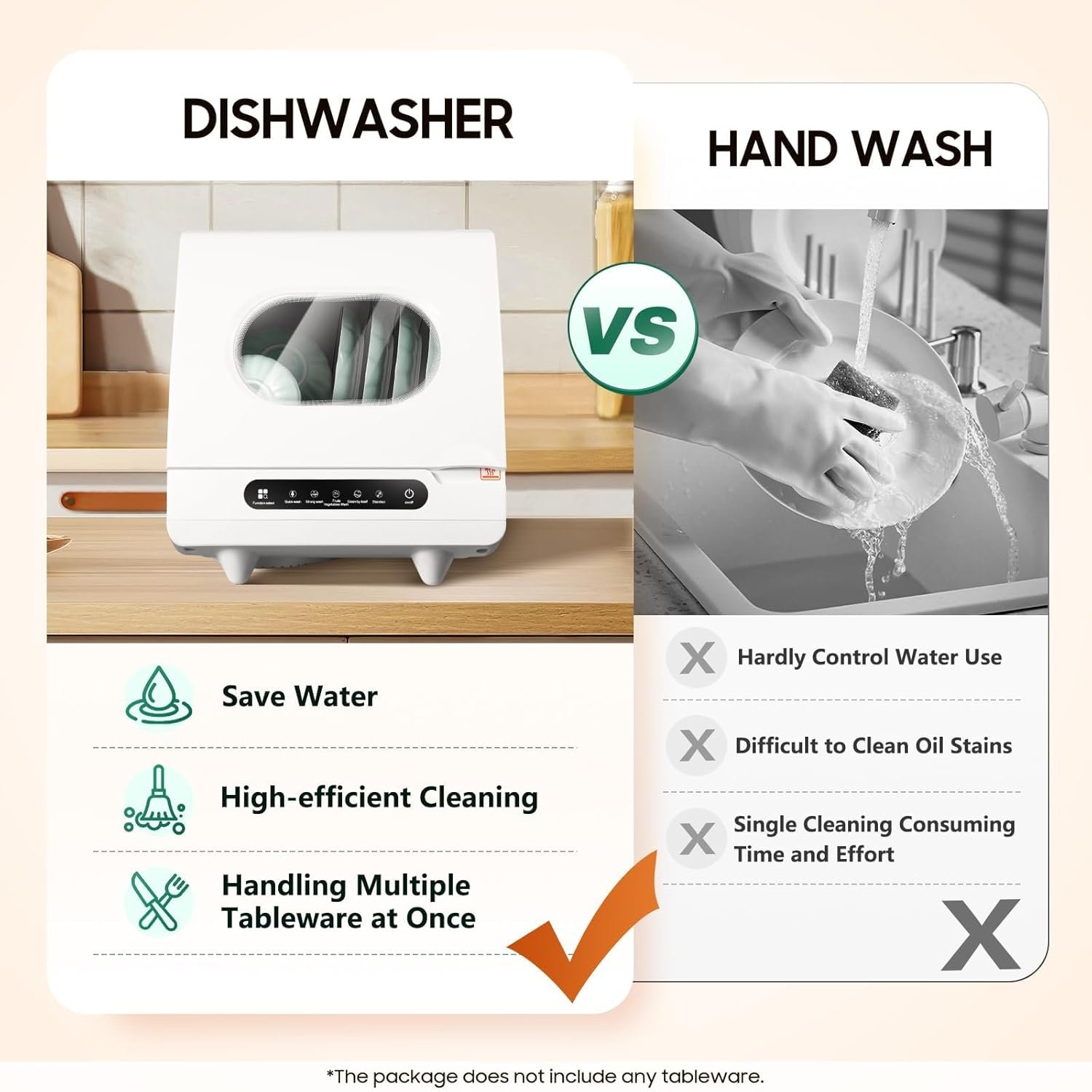 Compact Design: This Convenient Dishwasher Can Fit a Variety Of Dishes. It Can Hold 2‑6 Sets Of Dishes At Most, And The Water Consumption For Each Dish Washing Is 4-5L.