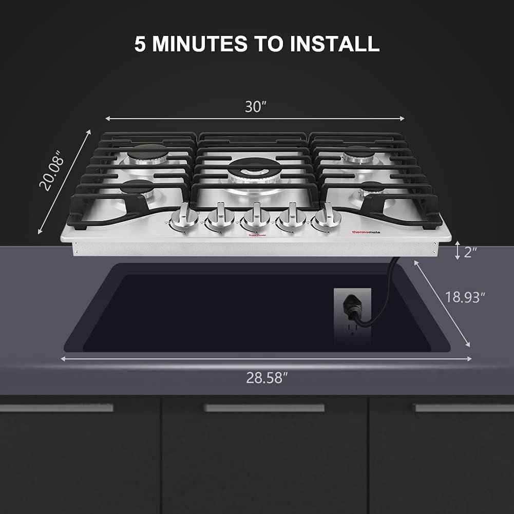 Update #2: (6 months of use ) Still very satisfied with cooking performance but disappointed the dial markings are already rubbing off, even with very gentle cleaning. Update #1: I’ve used the cooktop a great deal more over the last couple of months and remain very satisfied. # I searched for a while to find a 30″ gas cooktop with five burners for my kitchen renovation that placed the cooktop into a center island. In particular, I wanted one shallow enough to permit use of the top drawer of the base cabinet Also, I wanted a large center burner and continuous grate design that minimized the risk of tipping pots. I was not familiar with the Thermomate brand, but liked the look and specs of this model. I’ve had it installed now for about a month and love it. It lights quickly and the burners provide the power I need while operating smoothly. We did have to alter the back corner of the drawer as the gas connection interfered with the drawer closing at the very back, but a small cut-out solved it and did not sacrifice much drawer space. I highly recommend this model, it looks great and operates perfectly. I like it much better than my previous Ancona model purchased from Costco. The grate design is superior and it lights much faster.
