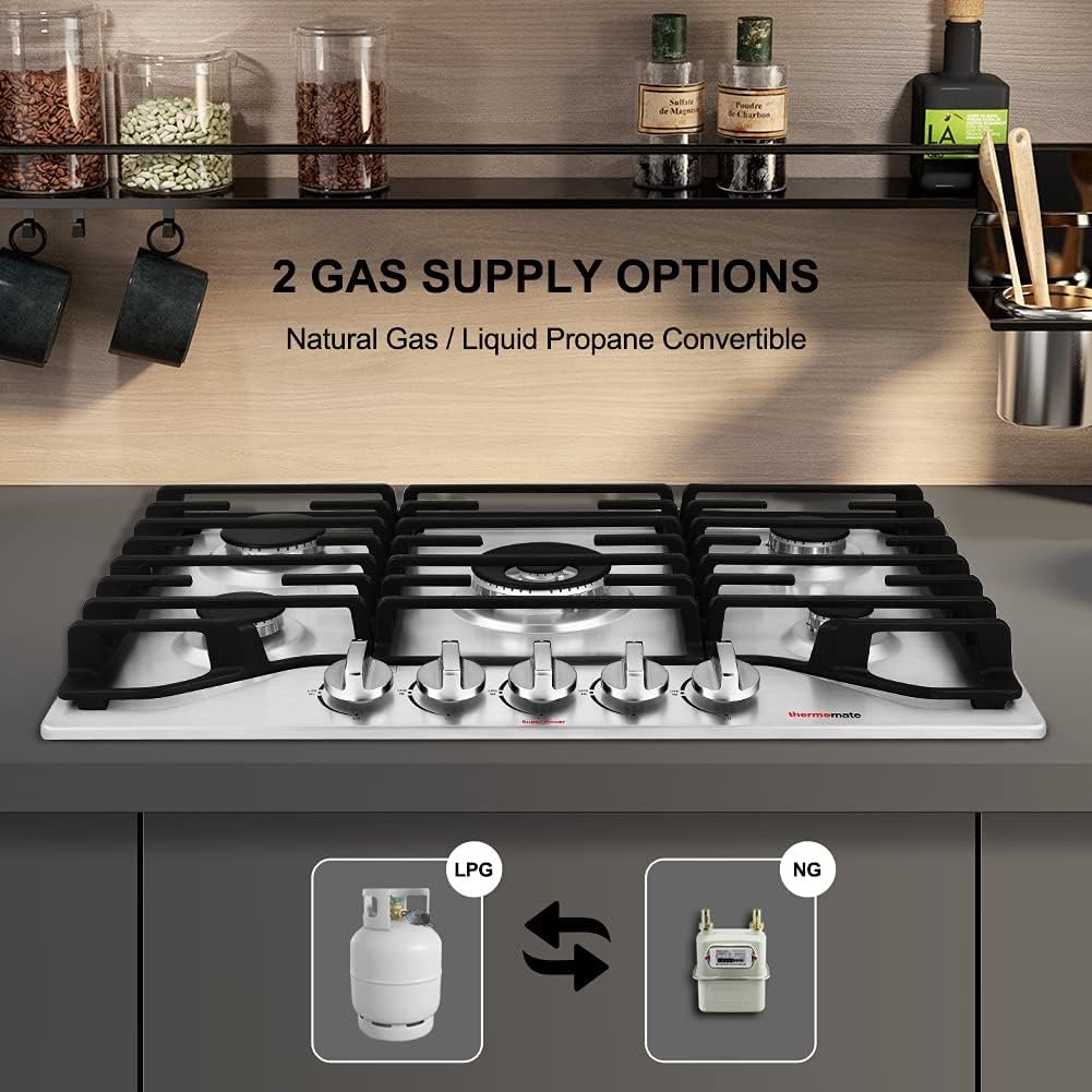 2 Gas Supply Options: The gas cooktop stove delivers the maximum 42,500BTU power to natural gas ( Preinstalled for NG) and liquid propane gas(LPG Conversion Kit included), you can choose either gas supply as you like. Capable for multi-purpose such as big kitchen, mobile home, cooking lover family, etc.