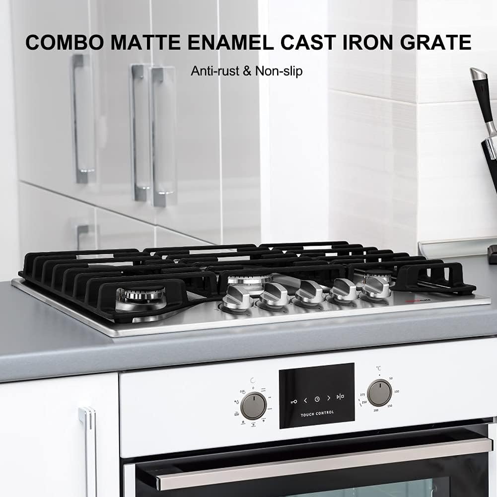 1 Minute to Clean Up: 0.03-inch thickness #304 stainless steel integrally molded panel and sealed burner designed for effortless cleanup and maintenance, the gasket under the knob can keep the food residue away. What’s more, the combo heavy-duty dishwasher-safe cast-iron grates are machine washable.