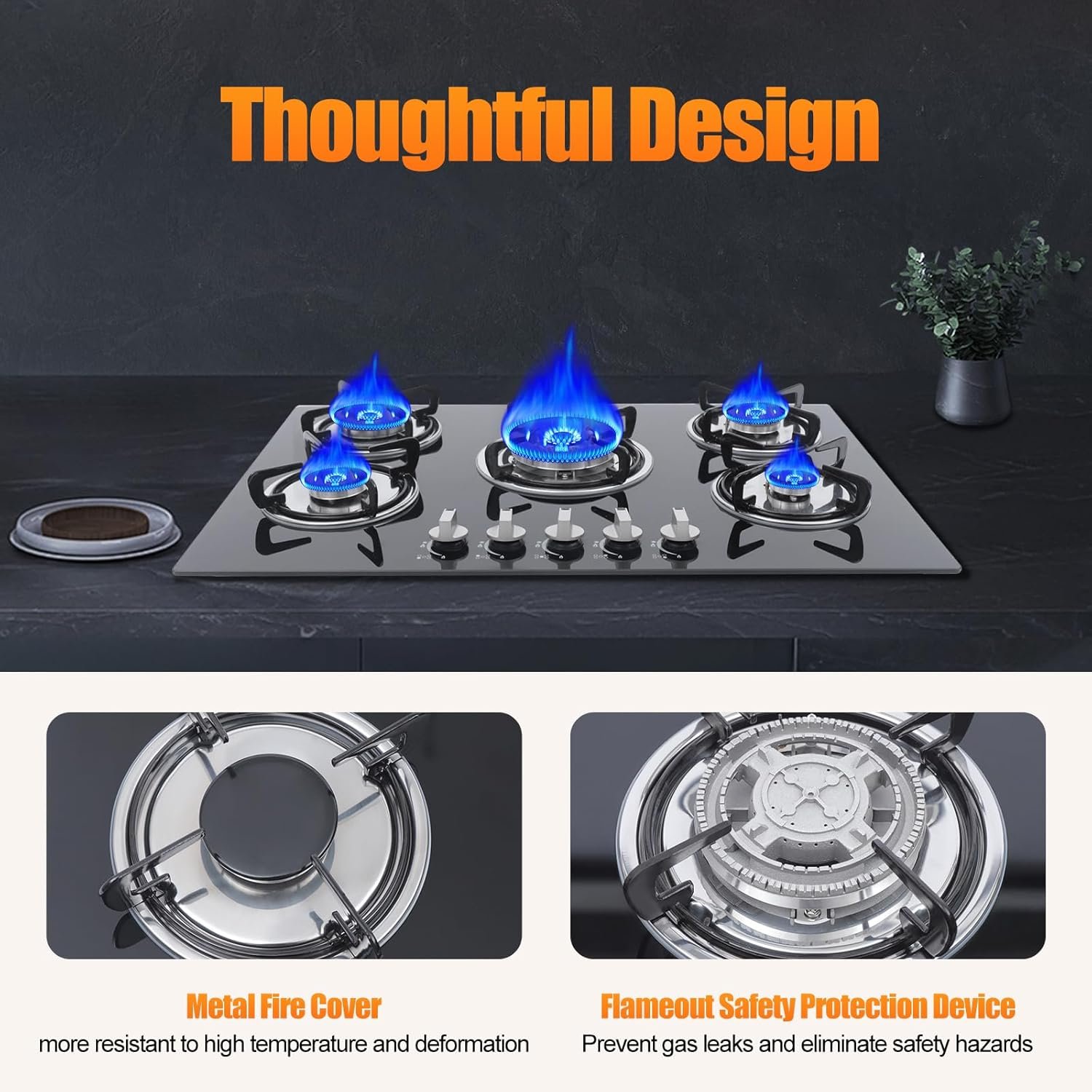 High Power Burners: High power burners can bring you quick cooking without less time so that you can finish as many dishes as you can in a short time.as the same time 30 in gas cooktop can achieve five cookings at the same time to meet all cooking requirements to achieve efficiency with less time and more dishes
