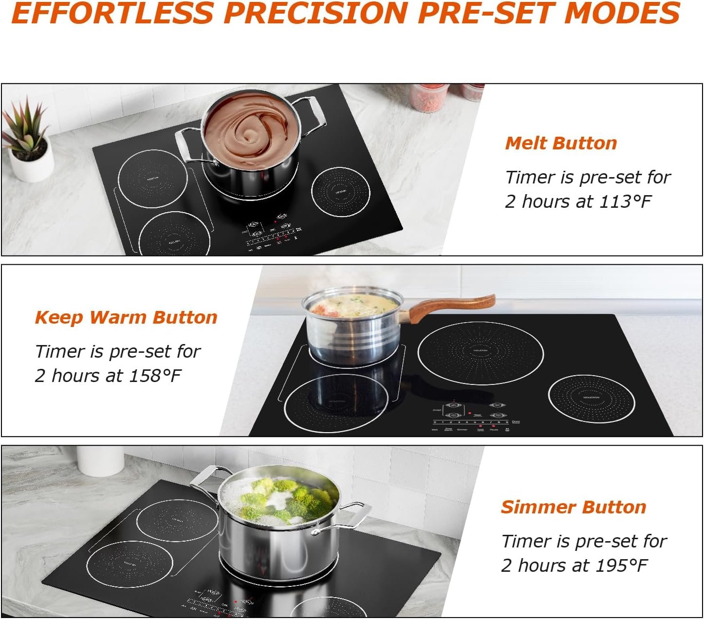Enhanced Safety Protocols: Safety comes first with our induction cooktop, which is equipped with multiple advanced safety features. Enjoy peace of mind with Residual Heat Warnings, Auto Shutdown, Overheat Protection, and a Child Lock. These integrated safety measures are designed to protect you and your loved ones from accidents, making our cooktop a safe addition to any kitchen.