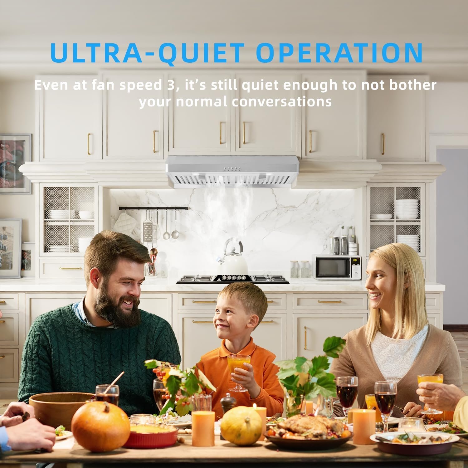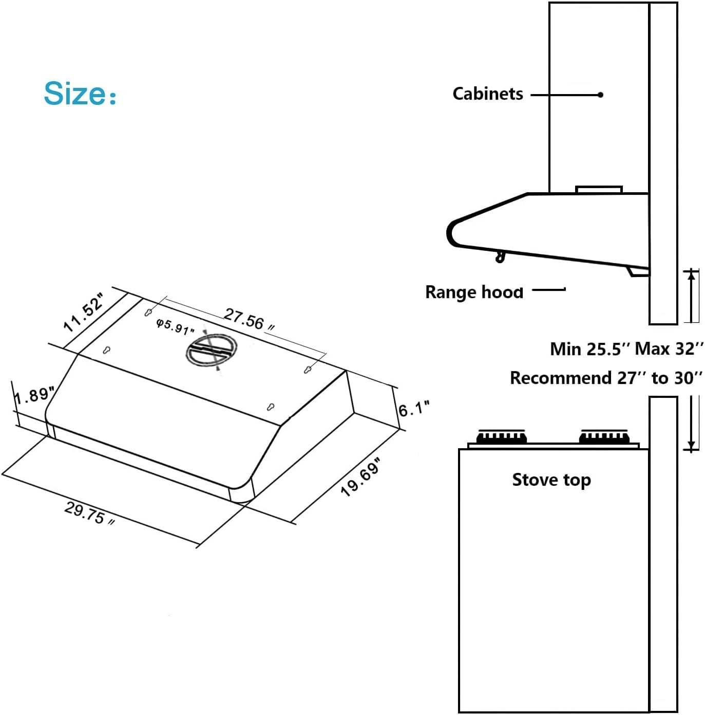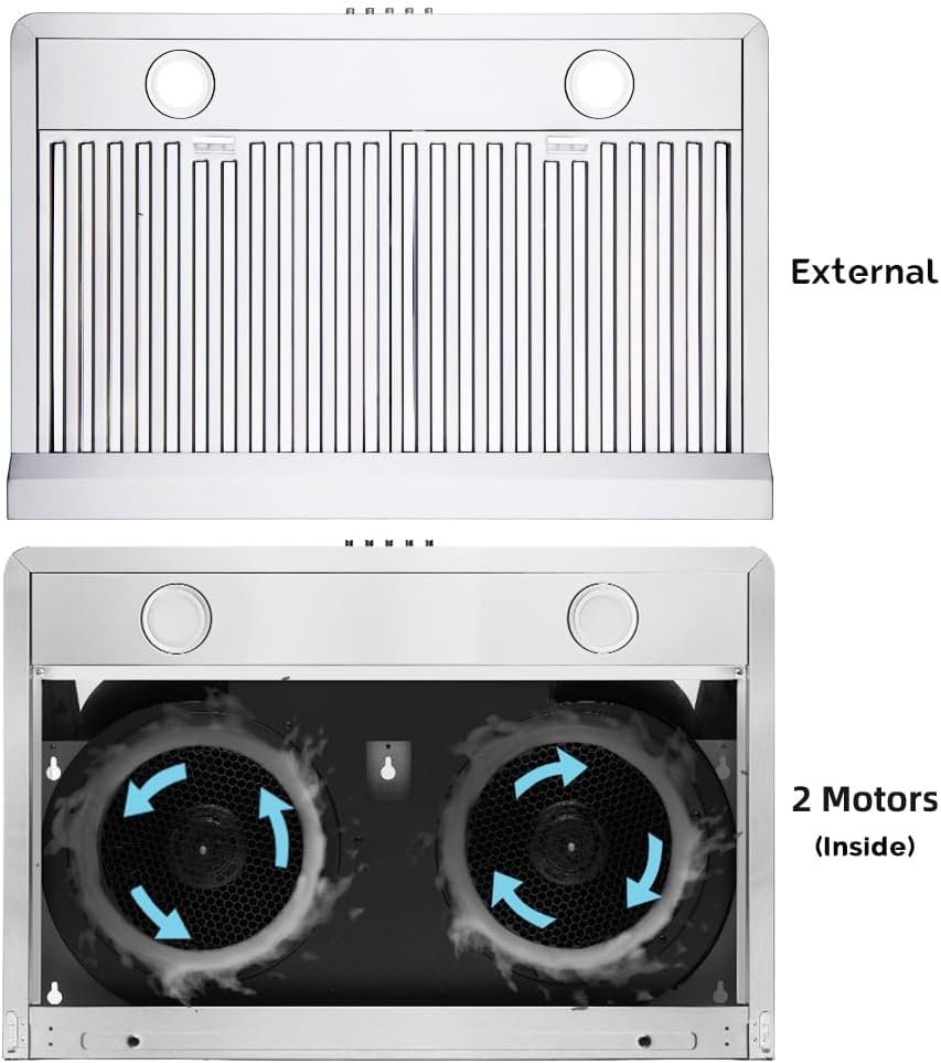 【Durability】Our Under Cabinet range hood 30 inch is built from seamless stainless steel for long-lasting performance.Its top and back are crafted using high-pressure die-casting, featuring rounded edges for safe kitchen integration and optimal performance in heavy-duty cooking environments with lots of smoke and grease