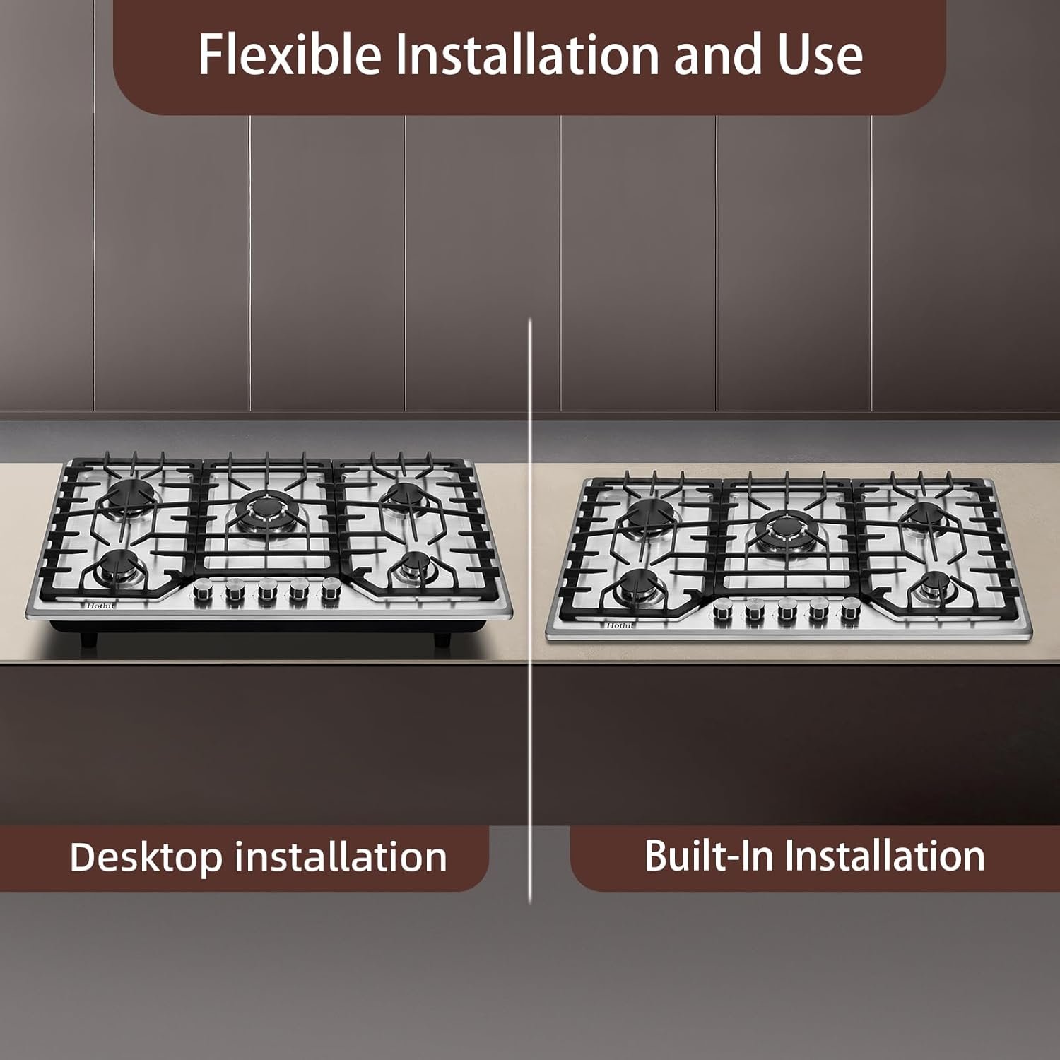 【5 Poweful Burners】Hothit gas stove top features 5 high efficiency sealed burners, Provide 3,6000BTU of powerful energy, These multiple powerful burners can meet your different cooking requirements. 11250 BTU×1, 9550 BTU×1, 6000 BTU×2, 3500 BTU×1