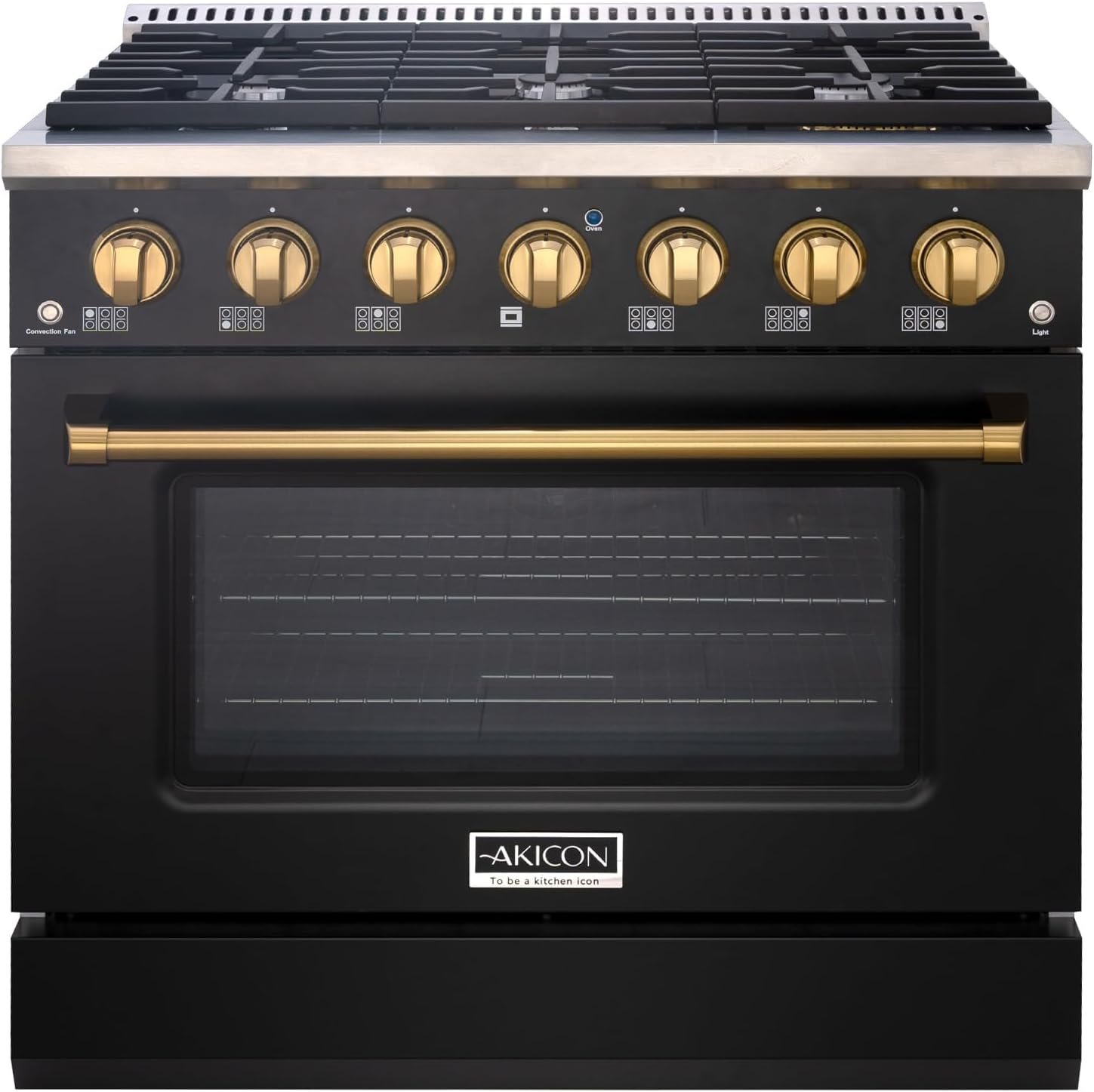 Akicon 36 Inch Freestanding Gas Range – Gas Oven Stove with 6 Sealed Burners, Heavy Duty Cast Iron Grates – 5.2 cu. ft. Capacity Rapid Convection Oven with Blue Porcelain Interior (Black & Gold)