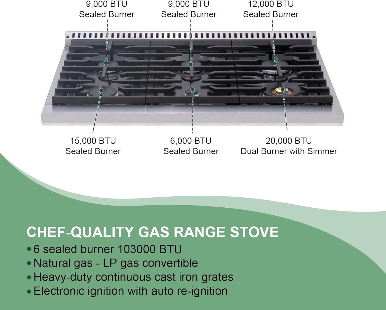 [Professional-Grade Gas Range Stove] Elevate your culinary experience with the Akicon Professional Gas Range Stove featuring 6 burners designed for all your culinary needs. Includes a powerful 20,000 BTU dual burner with simmer, 1 x 15,000 BTU burner, 1 x 12,000 BTU burner, and 2 x 9,000 BTU burners, along with a versatile 6,000 BTU burner. Perfect for searing, sautéing, steaming, boiling, frying, and simmering.