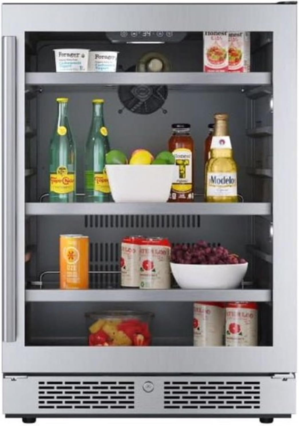 Internal LED lights with the option to alternate between blue and white; Compressor powered cooling; Fan forced front exhaust