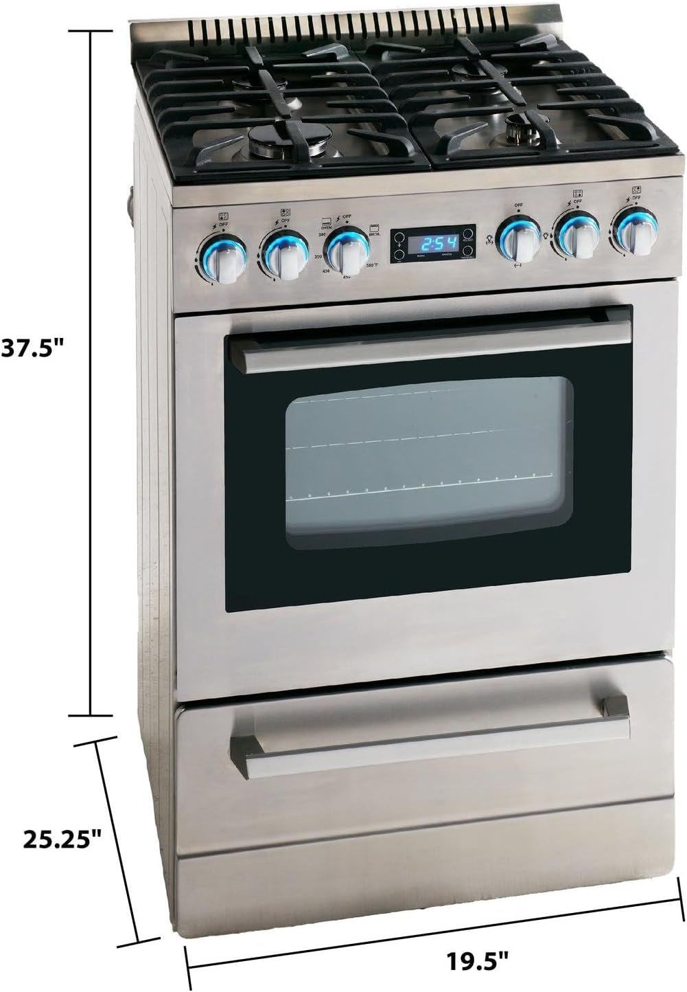 The Avanti ELITE Series 24-Inch Gas Range Oven is the ultimate space-saving solution for small kitchens, studio apartments, RVs, and vacation homes. With a 2.6 cu. ft. oven capacity and a stainless steel cooktop featuring 4 sealed burners (1 rapid, 2 regular, 1 simmer), this range provides versatility and performance. The oven includes 2 racks, a broiler with a broiling pan, and a soft-close roll-out storage drawer for added convenience. Its sleek design features a seamless framed glass oven door, LED backlit control knobs, and a digital timer/clock for modern functionality. Additional premium features like an automatic rotisserie, LP conversion kit, and ADA compliance ensure ease of use and accessibility. Backed by a 2-Year Manufacturer Limited Warranty, this range is a stylish and reliable addition to any compact kitchen.