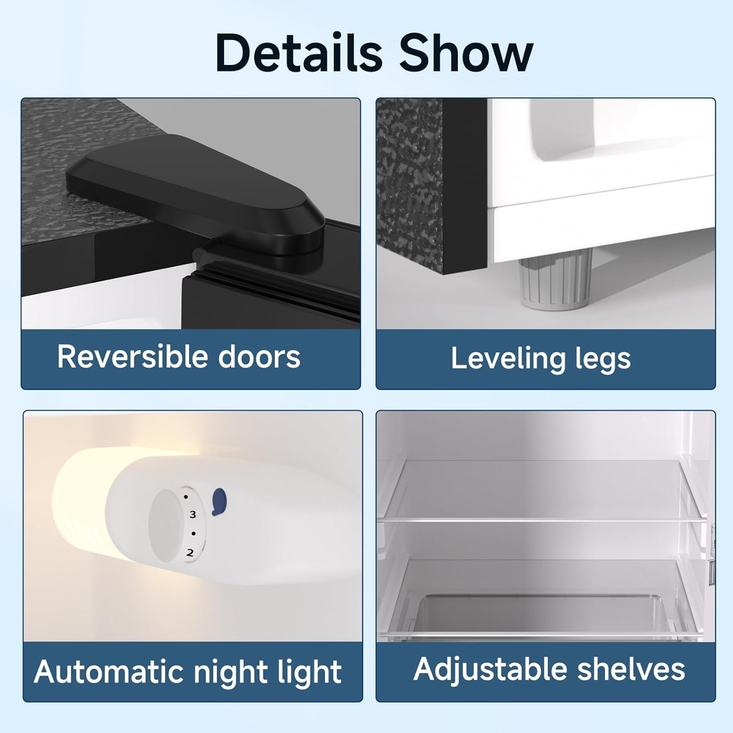 Enhanced details: BANGSON apartment size fridge comes with reversible doors to fit your preference. The automatic night light in the refrigeration compartment makes it easy to locate items in the dark. The bottom leveling legs allow it for stable placement on uneven surfaces. It also includes an ice tray, a defrost tool, and an egg shelf.