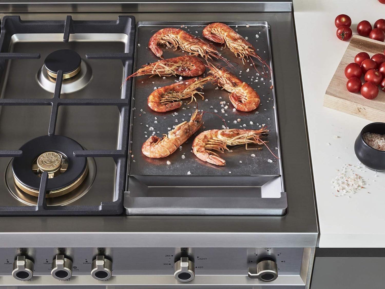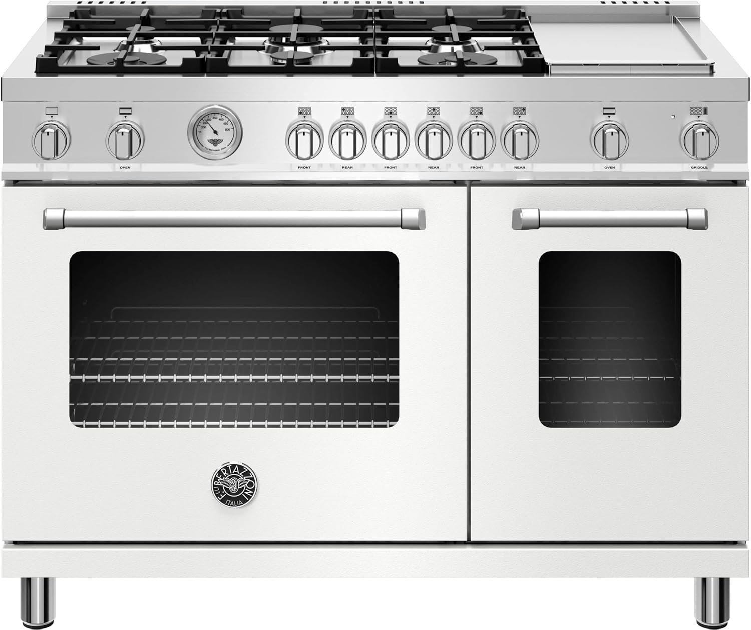 This 48″ freestanding gas range from the Master series comes with 6 sealed burners, a griddle and double ovens including a 4.7 cu. ft. main oven capacity and 2.4 cu. ft. auxiliary oven capacity. It also features soft motion hinges, low profile back guard, dual convection fans and a temperature gauge.