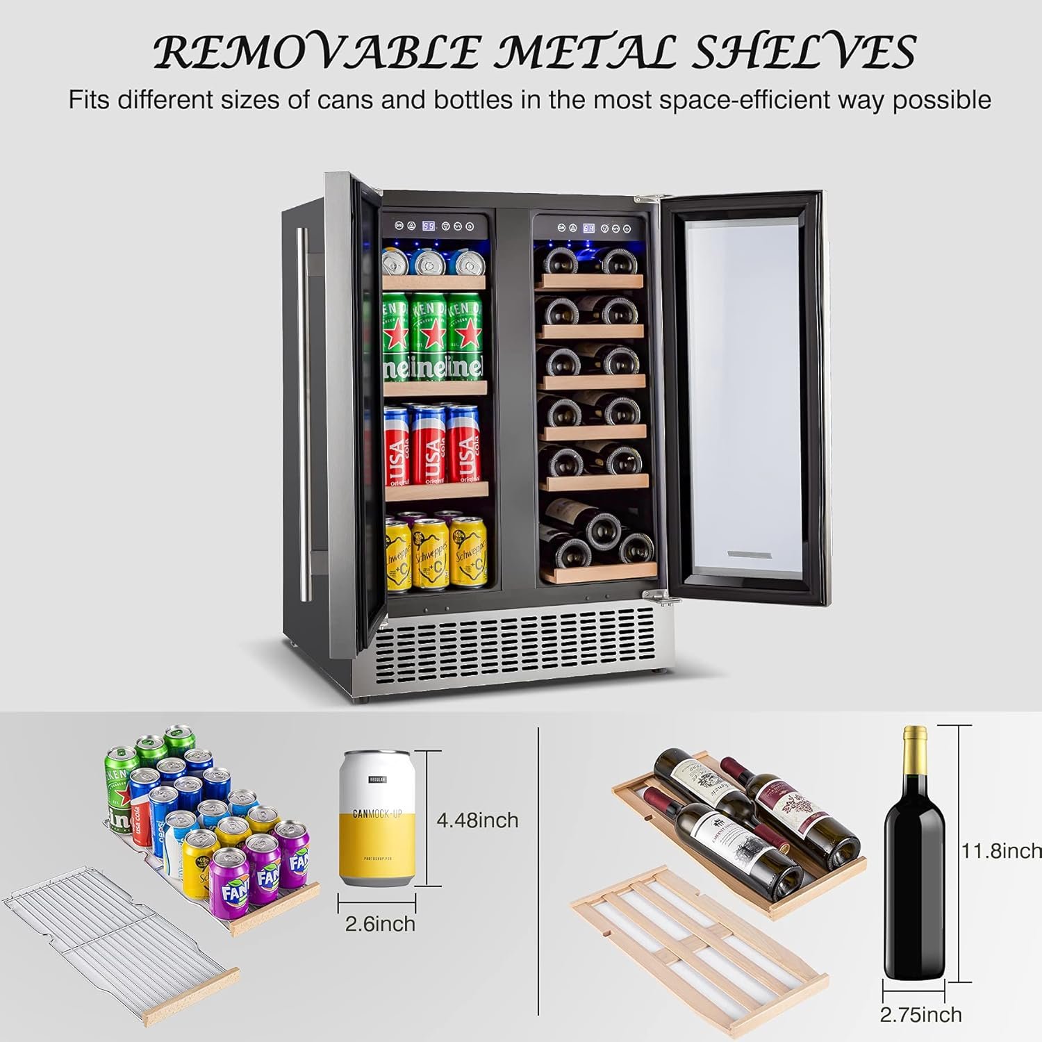 [Large Capacity & Adjustable Shelves] This BODEGA Wine and Beverage Fridge features a spacious storage capacity of 4.24 cu.ft. The left-side beverage refrigerator includes 3 adjustable wire shelves, capable of holding up to 57 standard cans of beverages. The right-side wine refrigerator is equipped with 6 adjustable beechwood shelves, designed to accommodate 18 standard bottles of wine. This 24 inch dual zone wine and beverage cooler is well-suited to meet your beverage and wine storage needs.