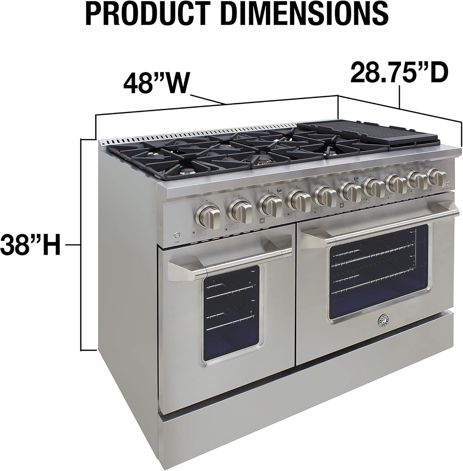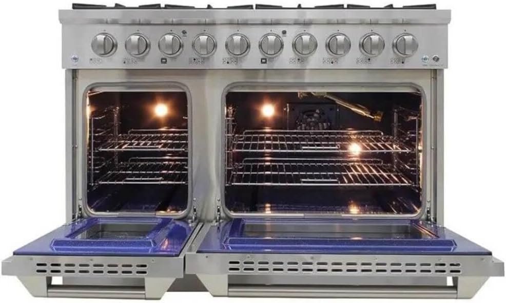 LOADED WITH FEATURES: Featuring large knobs, dual burner, continuous grates, 8 sealed burners, 3.5 and 2 cu. ft. oven capacity, blue porcelain oven, oven light, stainless steel drip pan, and a sleek industrial size pole handle. Product Dimensions: 48″ (W) x 28.75″ (D), 38″ (H). Electrical requirements: 120V / 60Hz / 20Amp