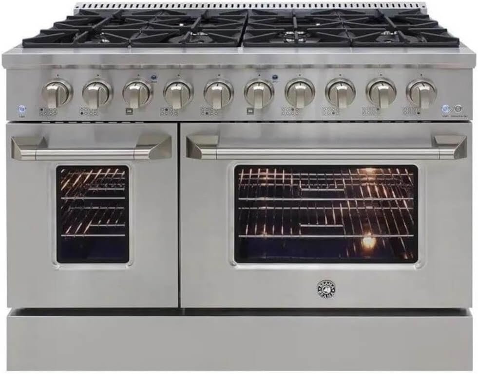 Elevate your kitchen with the stylish and compact Brama by Vinotemp 48-inch Gas Range Oven with 8 Cooktop Burners. This stainless steel gas oven boasts an array of features to enhance your cooking experience, including large easy-to-use knobs, a dual burner, continuous grates, 8 sealed burners, and a total of 6.7 cu. ft. porcelain oven space. The top blue lighting over each knob adds convenience and easy visibility during cooking. Experience efficient and even cooking with the advanced Convection Oven technology. The fan-assisted circular heating element ensures even cooking, delivering delicious results in less time and at lower temperatures compared to standard ovens. The high-performance gas burners offer exceptional control, ranging from high-heat boiling, frying, or searing to low-simmer for delicate sauces. The cooktop features 2 Auxiliary 6,000 BTU burners, 2 Semi-rapid 9,000 BTU burners, 2 Rapid 12,000 BTU burners, and 2 Triple crown 20,000 BTU burners. The premium Stainless Steel construction ensures long-lasting durability and a sleek appearance in your kitchen. The heavy-duty grates provide excellent heat retention and distribution for even cooking. With product dimensions of 48″W x 28.75″D x 38″H, this freestanding gas range fits perfectly into any kitchen space. It is designed for indoor use, making it an ideal addition to your kitchen setup. Enjoy the convenience of its versatile burners, spacious oven, durable construction, and stylish design. Please note that delivery, installation, and haul-away services are available in select locations to provide a hassle-free experience. Regenerate response
