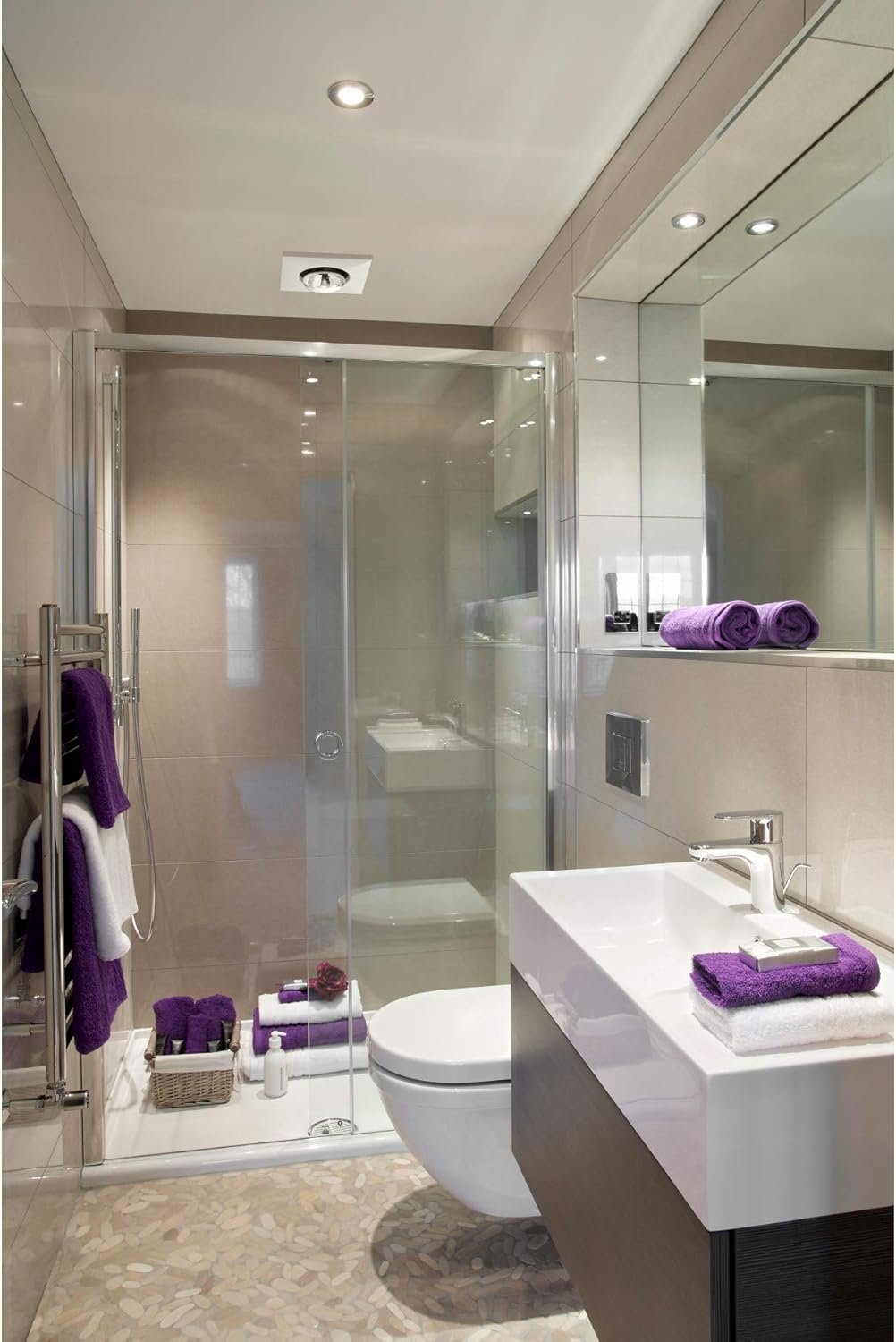 Perfect product. Quiet. Neat. Looks very professional. Easily installed. Gives good heat. We installed a timer and wow, perfection! The Grand kids love to shower at our to house.