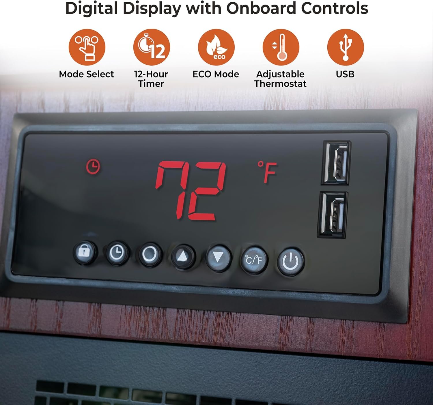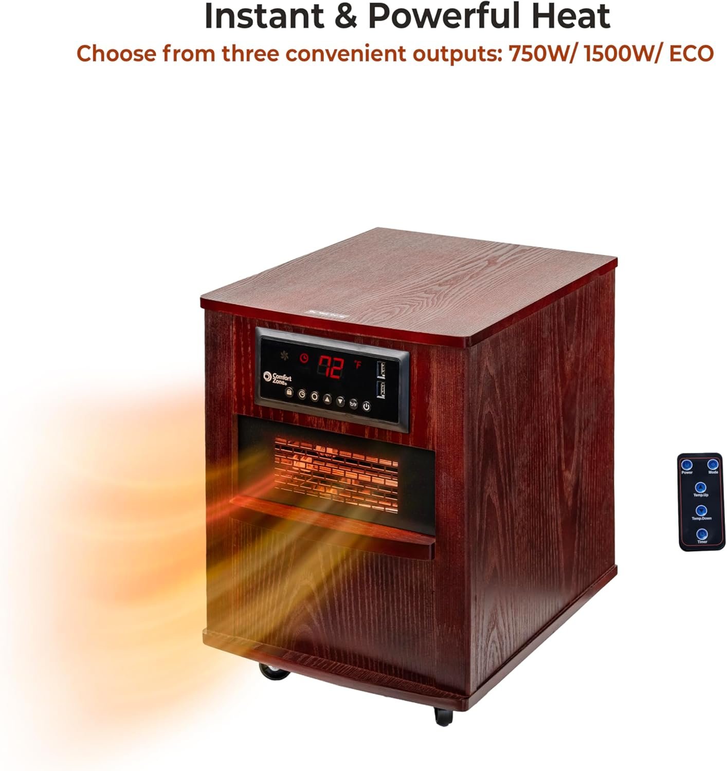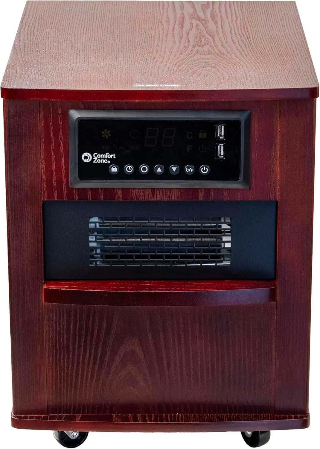 With six high-power quartz infrared heating elements, the Premium Wood Cabinet Infrared Heater by Comfort Zone provides even, room-wide comfort. It has two heat settings and an energy saving ECO mode with a 12-hour on/off timer. The digital thermostat display makes room temperature easy to read and the full function remote allows electronic control from across the room. The built in USB charging ports are perfect for electronic devices such as iPhones and iPads. Safety features include swivel casters for easy movement, tip-over switch, and overheat protection system. Heater comes in cherry finish and adds a touch of sophistication and class to any large room.
