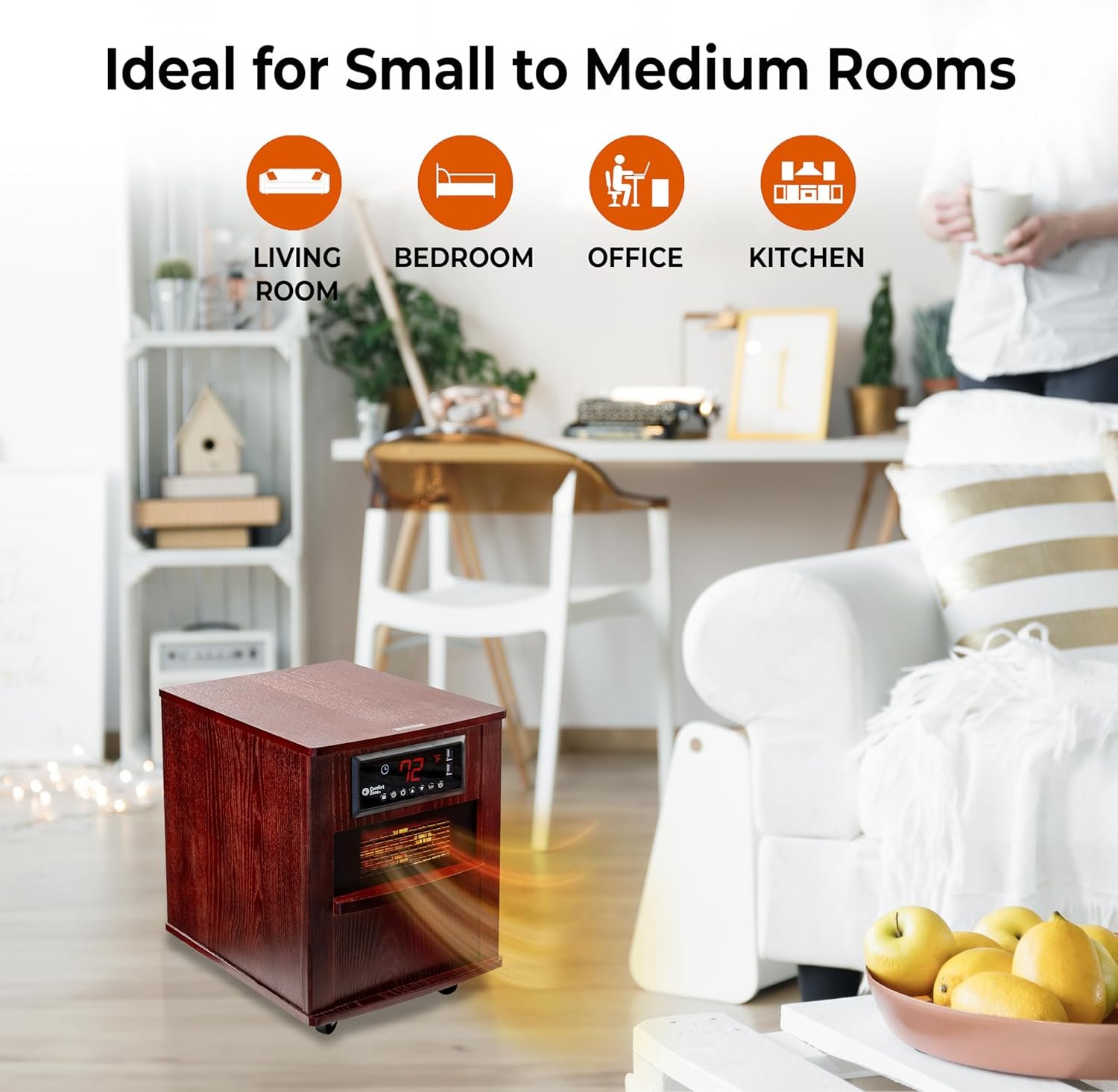 CUSTOMIZABLE TEMPERATURE CONTROL: Easily set your preferred temperature with the control panel arrows or the provided remote. The adjustable thermostat covers a range from 59℉ to 86℉ (15℃ to 30℃). Once your desired temperature is chosen, the heater stays active until the room matches the displayed temperature. Utilizing a seamless cycle of activation and deactivation, it reliably maintains the chosen room temperature. This adaptability guarantees maximum comfort, as the heater dynamically adjusts to uphold the preset conditions.