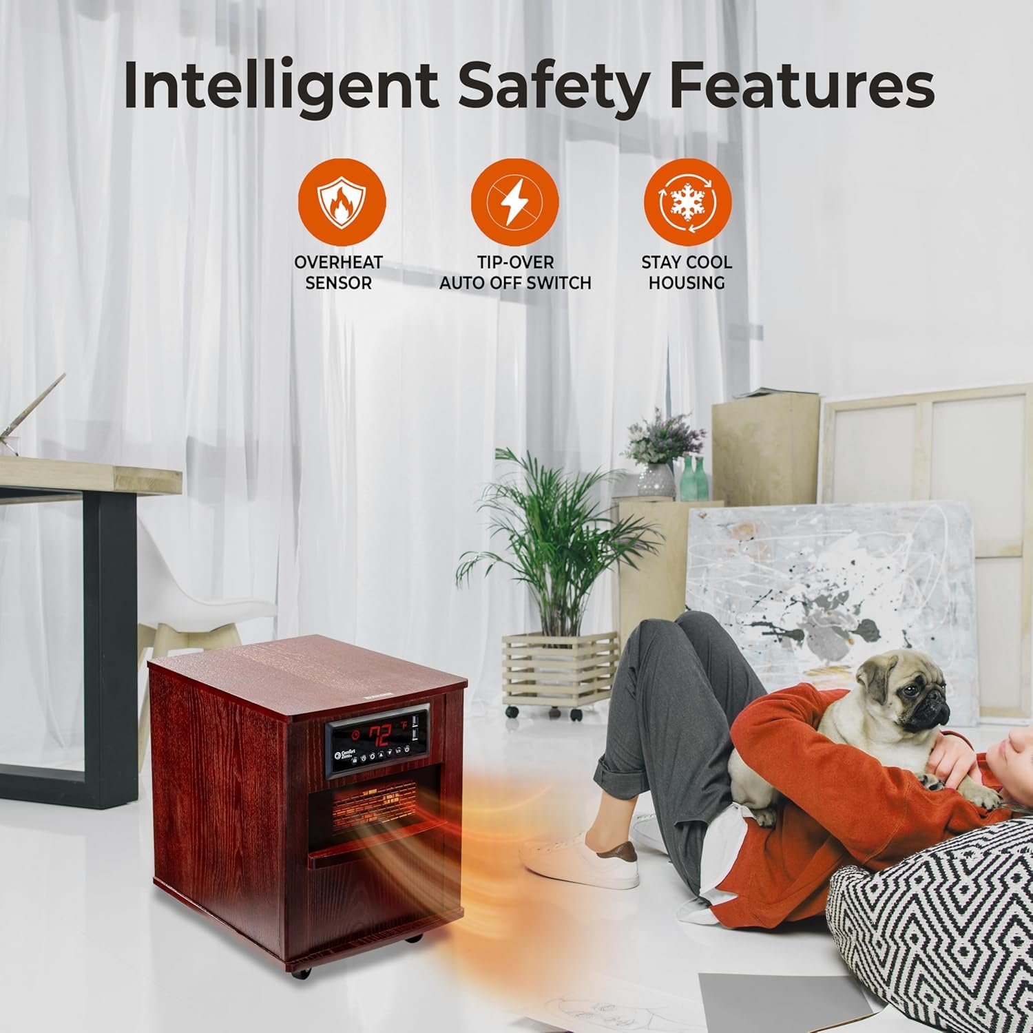 ENSURED SAFETY MEASURES: Incorporating a tip-over safety mechanism, this heater automatically powers down upon being tipped over. Once returned to an upright position, the heater resets, requiring reactivation either through the provided remote control or the heater’s control panel. With an overheat safety feature, the heater proactively shuts off if internal components approach a temperature that may lead to overheating or fire risk. To reset, turn off the heater, switch the master power switch off, unplug it, & allow a 20-minute cooldown.