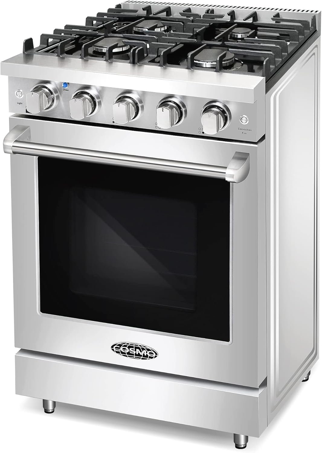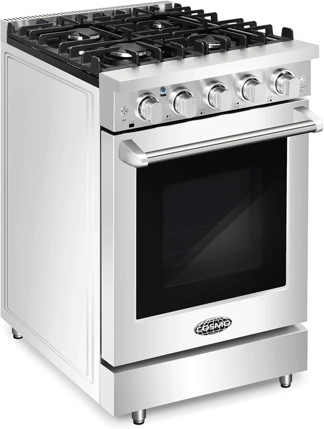 Cosmo’s COS-EPGR244 24 in. gas range brings high end styling and quality into your home kitchen at a compact size. The spacious 3.7 cu. ft. oven capacity lets you bake any dish while the gas cooktop with 4 sealed burners can handle all your pots and pans with ease. The cooktop is equipped with a variety of different burners to suit needs from the largest pots and pans down to the most delicate sauces: 18,000 BTU, 12,000 BTU, 9,000 BTU, and 3,500 BTU. In the convection oven, a powerful fan circulates air for fast, perfectly cooked meals every time. Oven includes a 12,000 BTU bake burner and 10,000 BTU broil burner. Our special oven functions give you the precision to create everything from juicy roasts to delicate desserts. Designed for durability, this 24 in. gas range is constructed with industrial, corrosion-resistant stainless steel. The Cosmo Haven Collection brings enhanced functionality and design, offering a well-rounded option for those looking for more convenience and style in an appliance