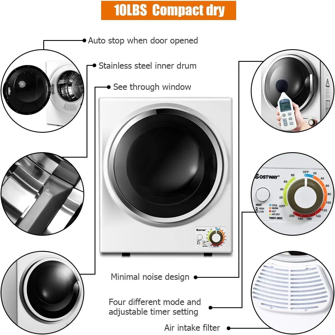 This is our brand new compact dryer with 10 lbs. cloth capacity, it will be your best helper to dry your cloth or sheet in a short time, It has four mode: air dry, cool, warm, and hot. You can choose the drying time or mode according to the material and weight of the cloth. This dryer combine the cooling, wrinkle, freshening, function, without taking up a lot of room will bring much convenience for your life. Don’t hesitate to buy one! feature brand new and high quality 1. 5 cu. Ft. Capacity allows you to dry up to 10 lbs. Of clothing stainless steel tub provides durability see- through window lets you monitor clothes as they dry four mode: air dry, cool, warm, and hot anti-wrinkle function helps reduce wrinkling Air Dry(0-80mins) run with cool air to freshening cool(0-20mins): cool down the temperature warm(30-120mins): dry and cool cloth, anti-wrinkle hot (120-200 mind): for drying large quantities or bulky item minimal noise design the filter inside is easy to access for cleaning wall mounted, place on firm horizontal ground or rack mounted (the bracket is not include)