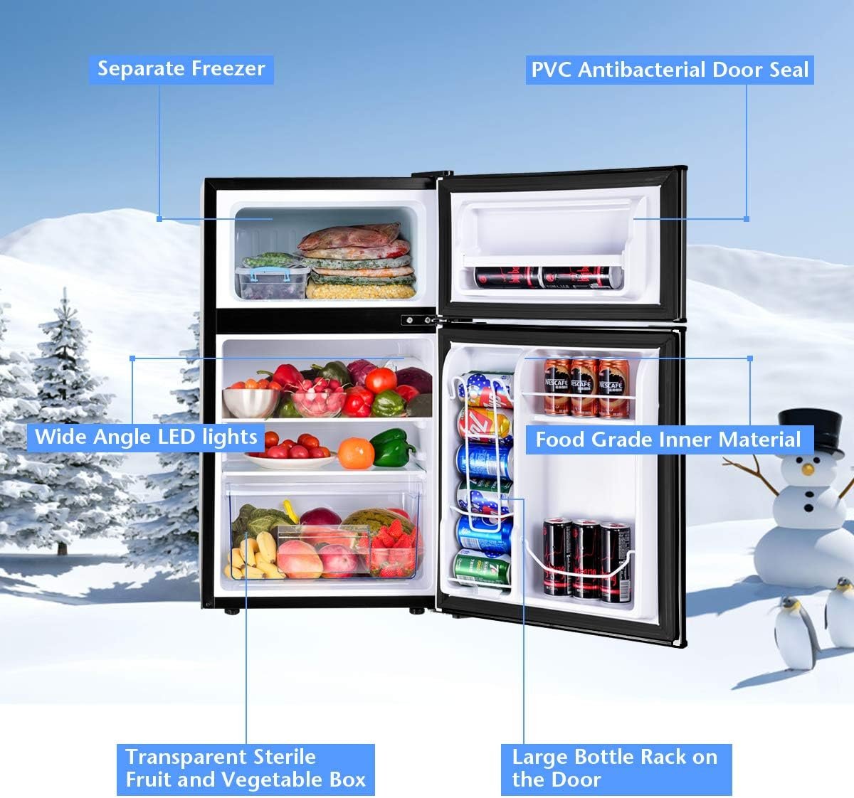️[2-Door Design] Our refrigerator has large 2.25 cu. ft. fresh food capacity gives you the space to keep foods organized and 1 cu. ft. freezer capacity give you room to store frozen foods. And the two refrigerator exterior doors allows you to access the freezer or the refrigeration compartment.