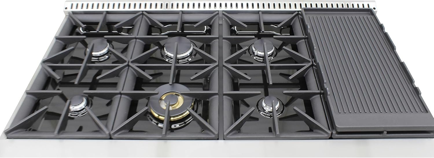 8 SEALED BURNERS: High performance gas burners which allow you to cook from a high heat for boiling, frying or searing to a low simmer for the most delicate sauces, Auxiliary burner 2 x 6,000 BTU, Semi-rapid burner 2 x 9,000 BTU, Rapid burner 2 x 12,000 BTU, and Triple crown burner 2 x 20,000 BTU