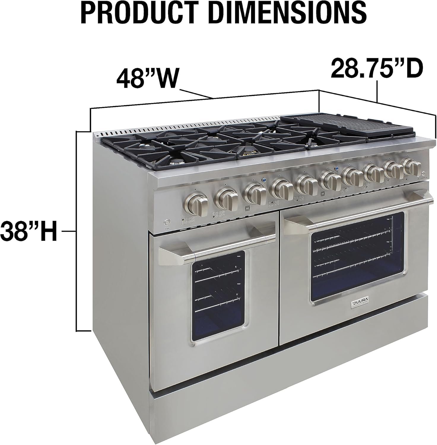 Show off your kitchen with this beautiful DUURA Elite® 48-Inch Double Oven Gas Range. The modern styling of this compact stainless gas oven will be a perfect fit for smaller spaces. Features of this unit include large knobs, dual burner, continuous grates, eight sealed burners, 3.5 and 2 cu. ft. oven capacities, blue porcelain oven, stainless steel drip pan and a sleek industrial size pole handle. The convection fan and light switches are on the sides of the control panel, and the oven indicator lights in blue signal that you left both ovens on. Designed for indoor use, this oven makes a perfect addition to any kitchen space!