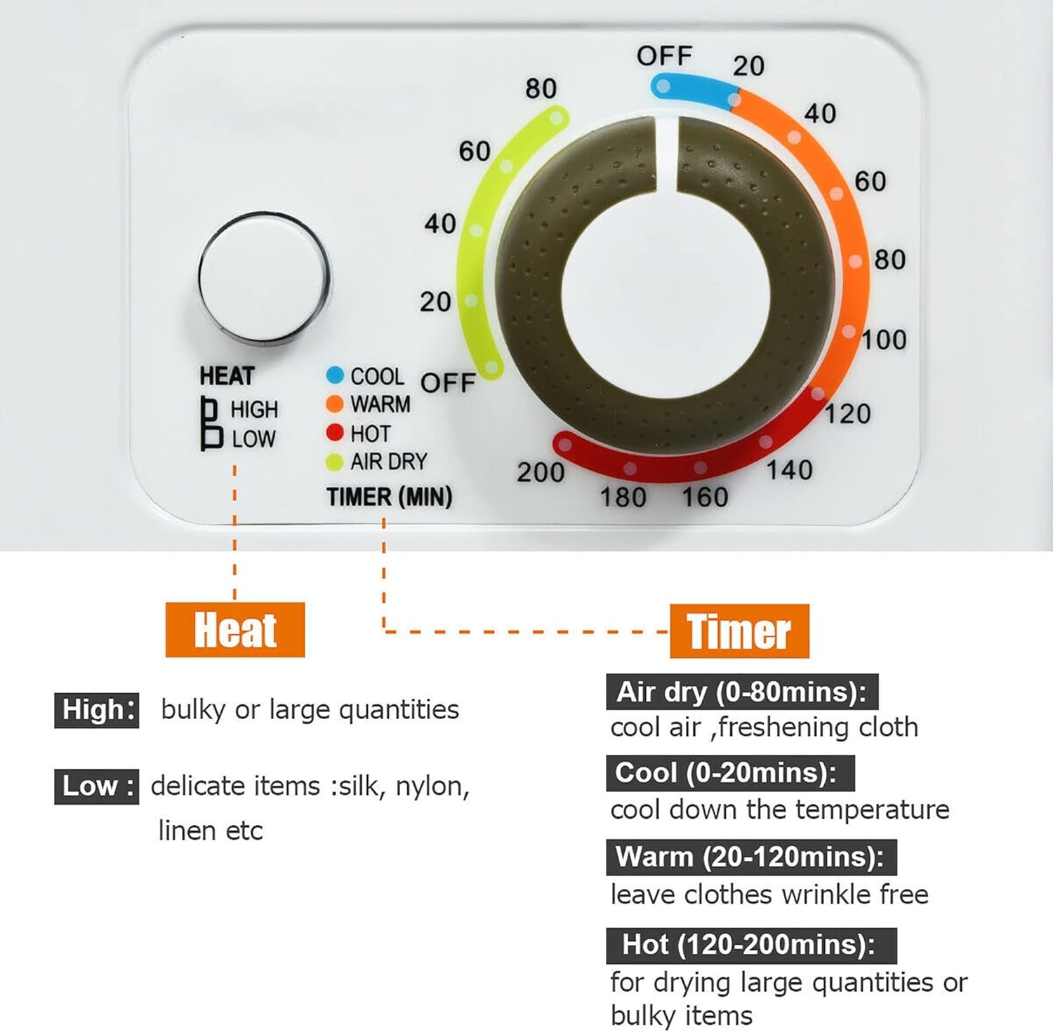 【Multifunction】According to the material and weight of the cloth, you can set the time length or different mode for drying: Cool(0-20mins): cool down the temperature, Warm(30-120mins): dry and cool cloth, Anti-wrinkle, Hot (120-200min): for drying large quantities or bulky item, Air dry(0-80mins) run with cool air to freshening.