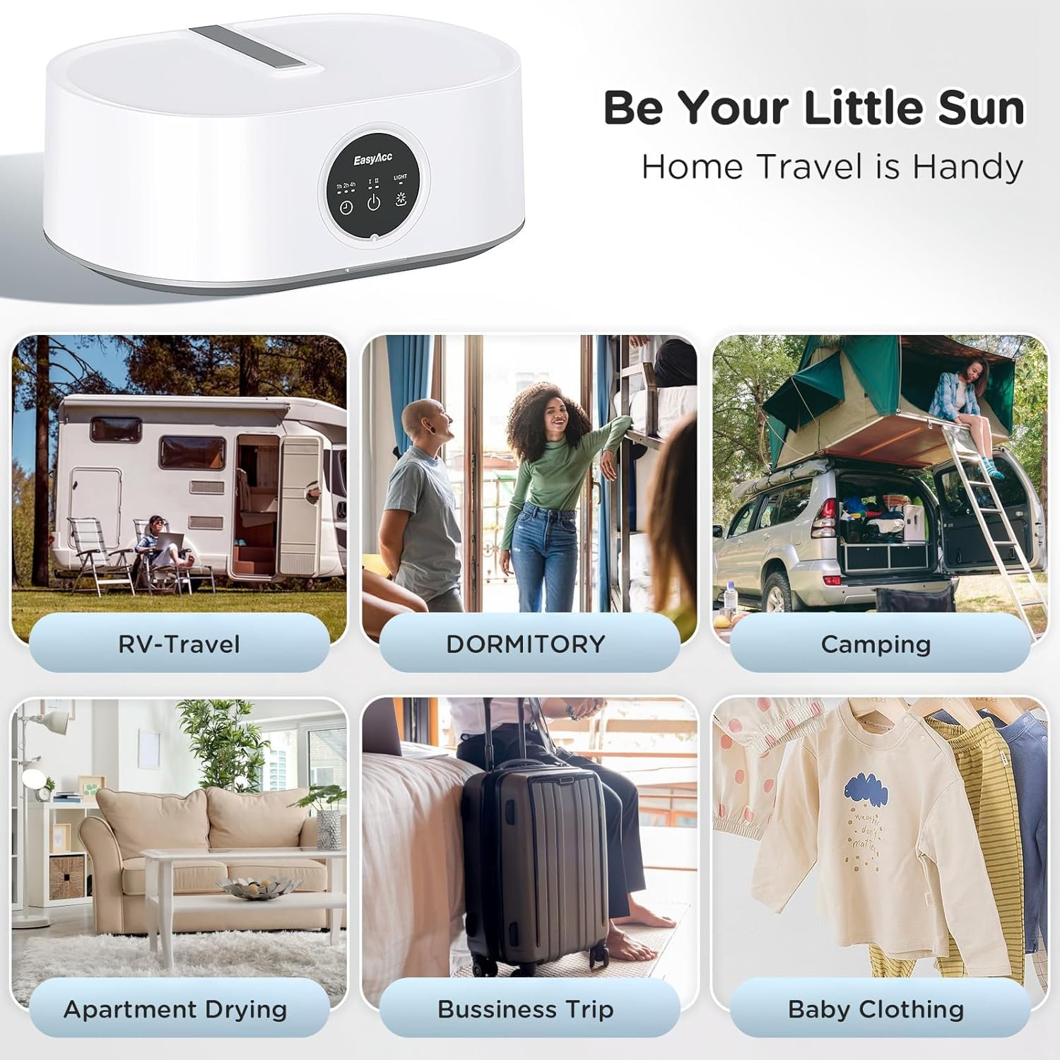【Deep Cleansing with Built-in LED UV, 1/2/4H Timer Function】The travel clothes dryer features a built-in LED UV system that revitalizes your garments with impeccable cleanliness and purity. With the timer function, you can easily set the desired drying time (1H, 2H, 4H) to suit your needs.