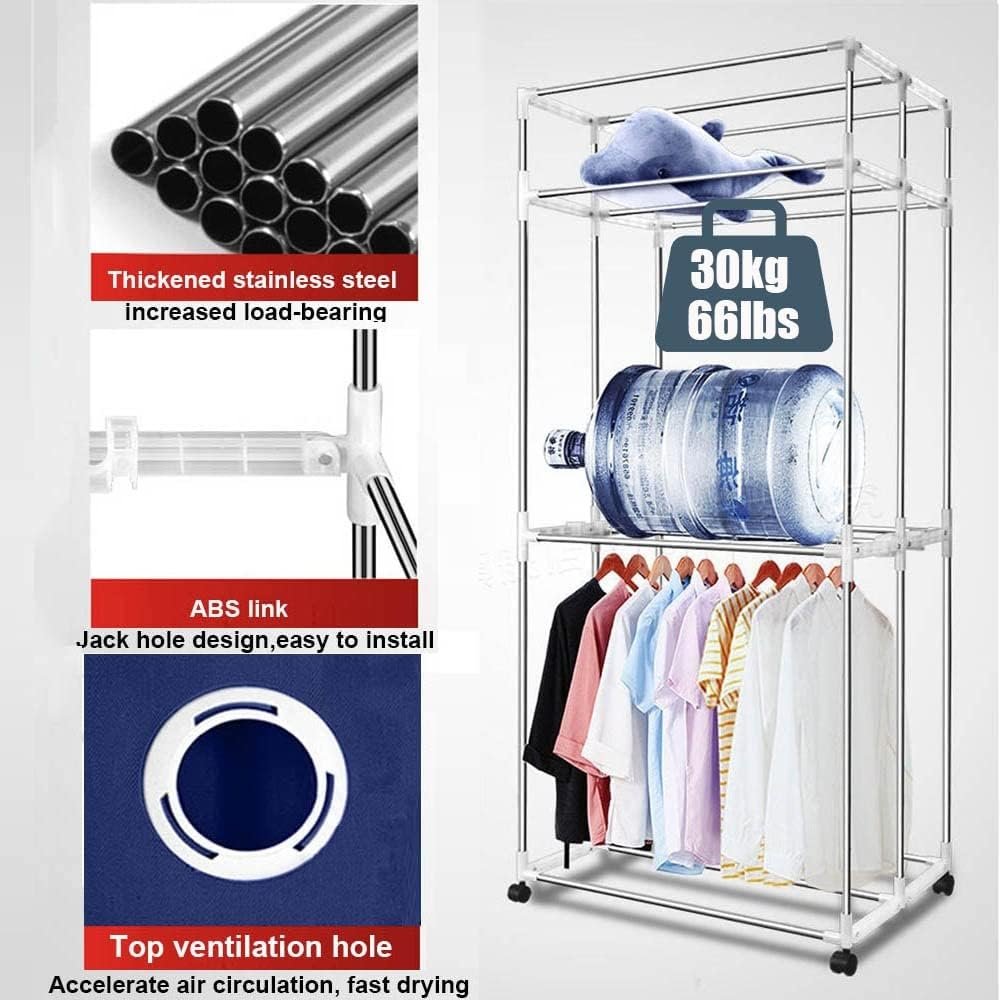 Stainless steel frame dryer, more sturdy, beautiful without rust, won’t shake, can hold 30kg/66IBS of laundry, high concentration of negative ions to remove odor, clean and pollution-free clothes. 4 universal wheels, free to move to the desired position.