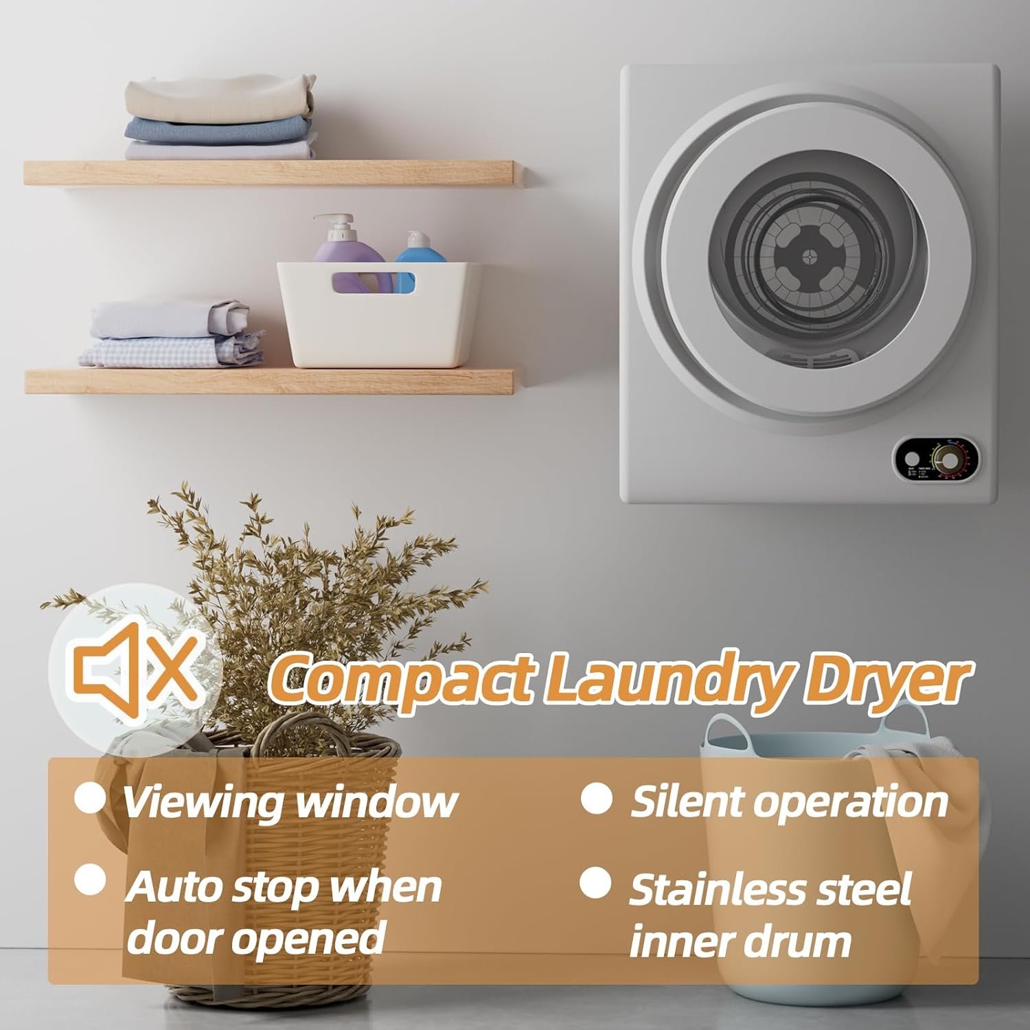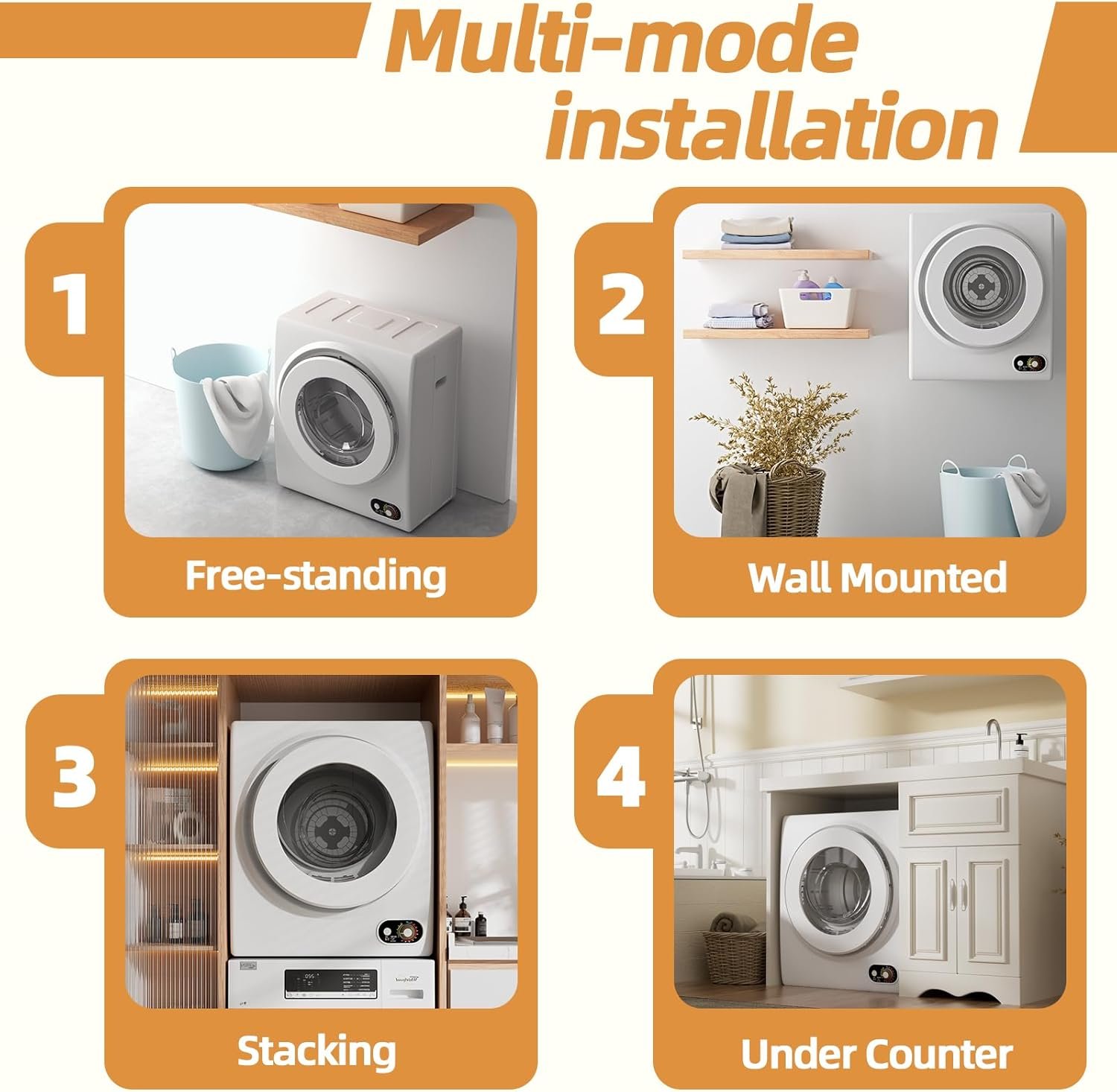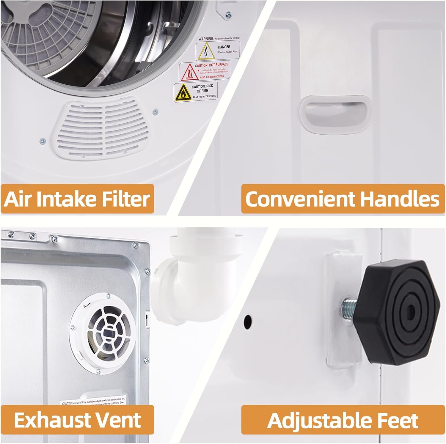 【Compact Dryer】Ideal for small space places such as RVs, flats and offices. Small in size and weighs only 37.48 lbs, it can be easily carried by just one person. This dryer is 120V, ETL certified, comes with a removable lint filter and mounting bracket, which also saves you on electric bills.