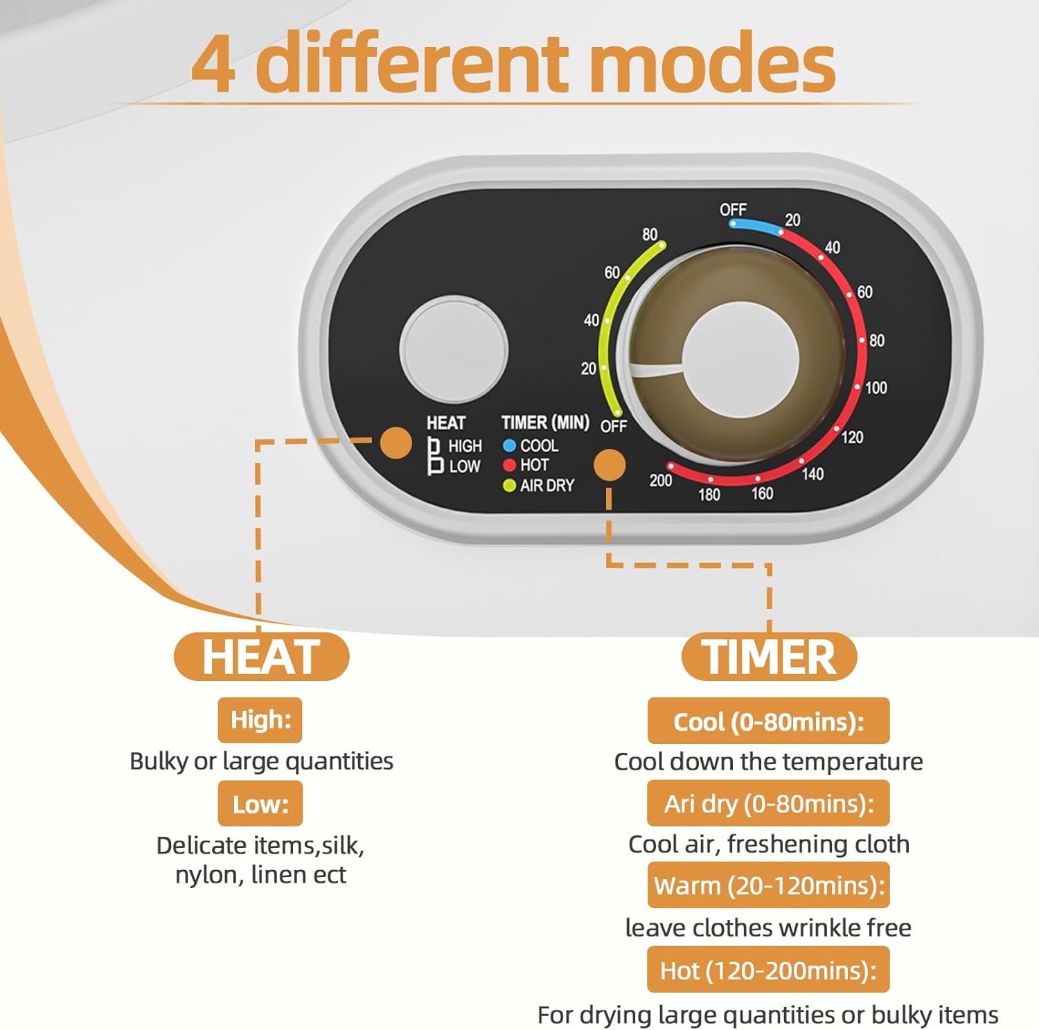 【4 Drying Modes】4 drying modes for you to choose any use. Cold(0-20 minutes): cool down the temperature; Warm(30-120 minutes): drying and cooling clothes, anti-wrinkle; Hot(120-200 minutes): for drying a large number of clothes or bulky clothes; Air-drying (0-80 minutes): freshening the clothes with cold air.