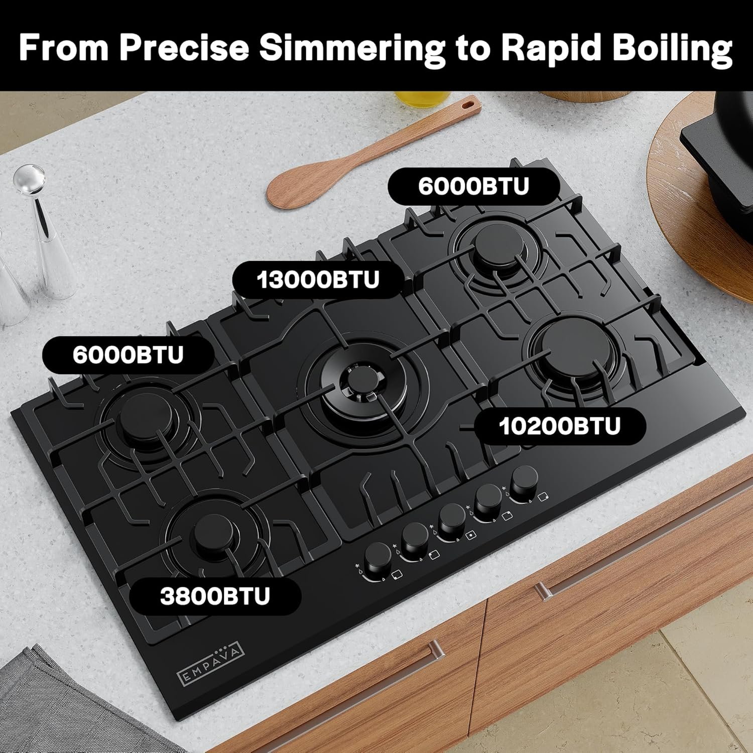 Empava recessed gas cooktop offers you the flexibility you need to make all your favorite dishes with precision and flair 4 different versatile burner size with a Dual Ring 12000-BTU burner, a 10000-BTU burner, double 6500-BTU burner and 4000-BTU burner distribute even heat for simmer, boil, stir-frying, steaming, melting or even caramelizing!