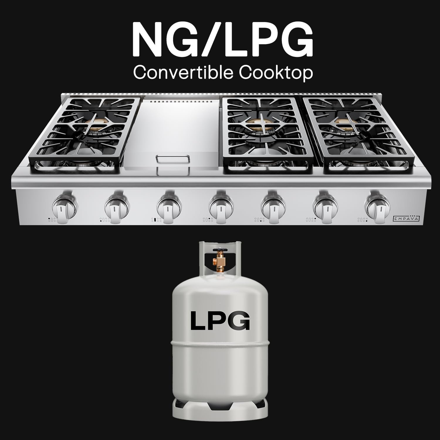 Empava 48 in. Pro-Style Professional Slide-in Natural Gas Rangetop with 6 Deep Recessed Sealed Ultra High-Low Burners-Heavy Duty Continuous Grates-Infrared Griddle in Stainless Steel, 48 Inch, Silver