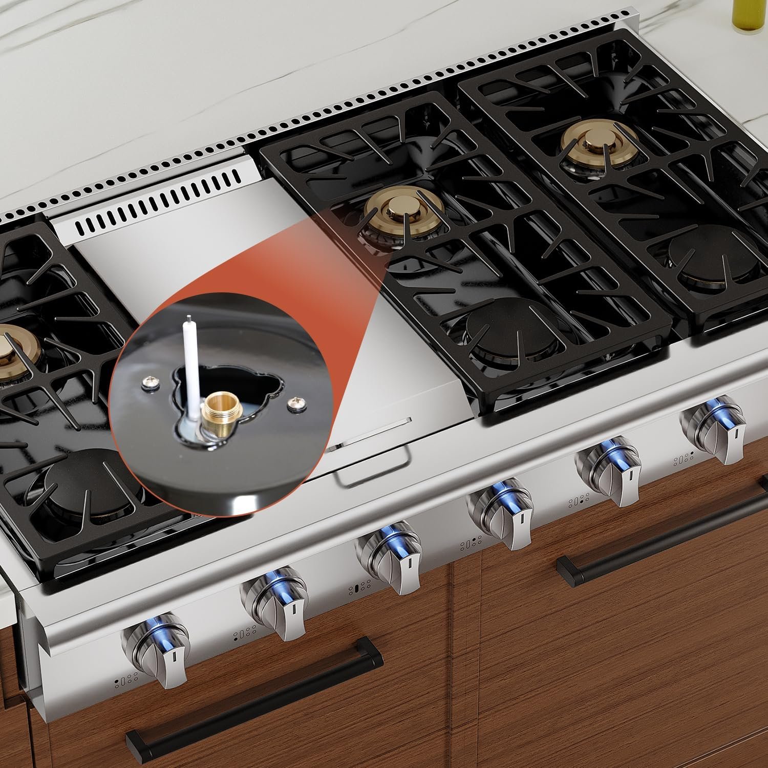 Now you are cooking! Enjoy all these features even more by knowing this gas range top cooktop. Product dimensions: 47. 9 in. W x 28. 38 in. D x 8. 72 in. H. Cutout dimensions: 48. 12 in. W x 24. 77 in. D x 7. 3 in. H. Pre-installed for natural gas (gas regulator included), can be converted to liquid propane gas use (LPG conversion kit not included). Pre-installed US standard 120v GFCI power cord (electric ignitor), 15 amps breaker required.