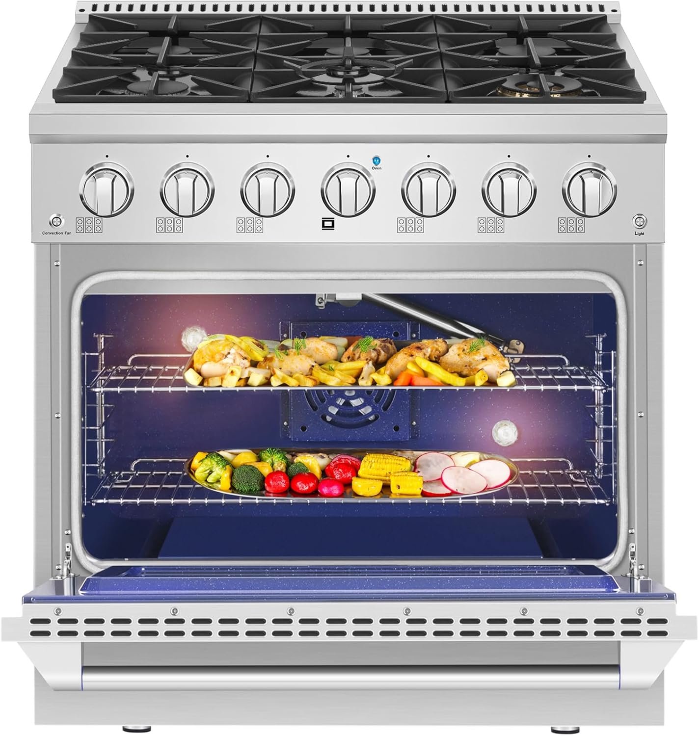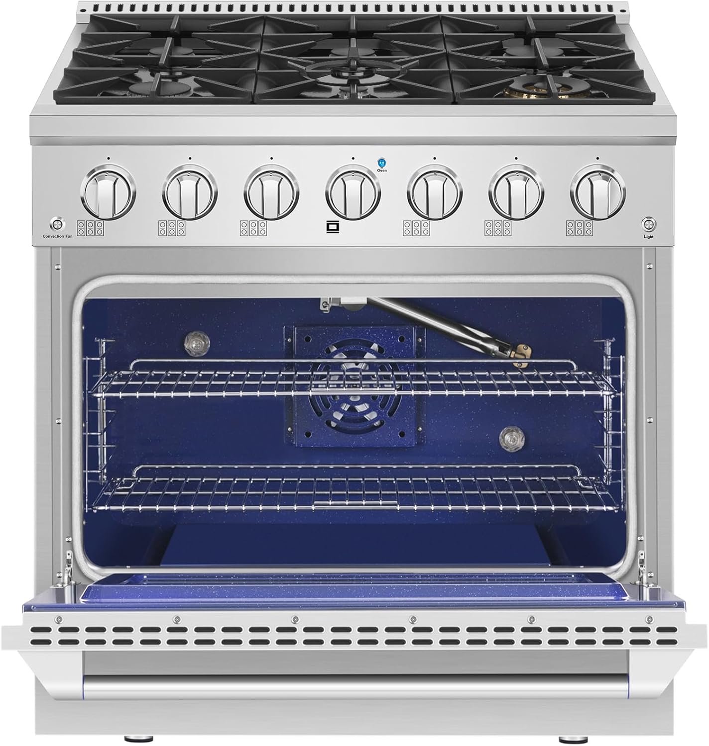Convection Oven: This 36 inch gas range offers a commercial convection fan inside, circulates hot air above, below, and around, providing ideal temperature and airflow for fast preheating and even cooking, which helps Eliminate cold spots and ensures even baking