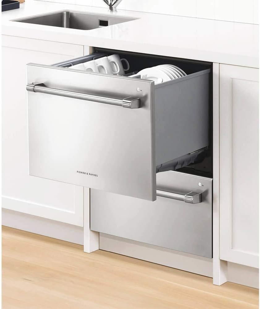 There’s not a lot of info on these dishwashers in the states so I wanted to add my experience. We are a couple, not a family, so our usage may differ from most of the other reviews here.First off, I absolutely love this dishwasher(s). When remodeling our home I wanted to try and do some things a little different from the standard American setup that I thought might improve our lives. I’ve seen these dishwashers in the past and have always been fascinated with them so I finally had the opportunity to pull the trigger.You need to remember that you have probably gone your entire life using essentially the exact same dishwasher setup with minor variations. This dishwasher is not a minor variation, it’s almost entirely different. That means there’s a bit of a learning curve, and you definitely need to read the manual to understand all the different racking options. Just about any time I do something radically different I get anxiety that I’ve made a massive mistake, this dishwasher was no exception. You will probably spend the first few days trying to figure out how to shove your largest items into the drawers while still leaving room for other things and trying various strategies to get the same amount of stuff in there lamenting that it’s impossible. Let me tell you, you get used to it. You figure it out. You get really good and really efficient with this machine just like you used to be with your previous unit. My wife doesn’t do well with change, but I showed a few tricks and she’s gotten really good with it as well. You will learn that there are pros and cons to both dishwasher styles and which is better likely really depends on how you like to do your dishes and the amount of dishes you regularly do.Ok that’s my summary, now let me put my personal pros/cons in a nice list for youPRO – The dishwasher is actually good at washing dishes. Both drawers, even with awkward loads, clean just as well as any other dishwasher I’ve used. I believe there is some kind of fan to dry the dishes after washing, they are always plenty dry. My previous unit was a Bosch which are always highly rated.PRO – We always have clean dishes waiting. Sometimes they are actually put away, more often they are left in one of the drawers to be unloaded while loading the other. The great thing is the amount of dishes you have to load/unload is now cut it half. It’s so much less of a chore when you are loading, unloading, or doing both alternating between the drawers. If you anticipate filling both drawers every single time all the time, this is not the dishwasher for you.PRO – You ever have a small load, too small to warrant running the dishwasher? Never again. You ever use the same things over and over again making dinner and get frustrated because they weren’t washed the previous day due to my previously mentioned problem? Never again. Using either the big or small drawer I never feel wasteful tossing a couple things in to avoid them sitting out or not being ready for the next day.PRO – You’ve got two dishwashers. They are mostly, possibly entirely independent. If something happens to one, the other still works. I had my top unit stop washing and flashing a code. I just moved everything to the bottom unit while I researched the code. The code was from low water pressure, which was from air in the lines from me changing my whole house water filter. Code reset 30 minutes later and dishes almost already done in the other drawer.PRO – If you are the DIY type, I can tell you this dishwasher is going to be MUCH easier to work on. During installation you may need to remove the drawers to access certain mounting holes, I did, and the way this thing comes apart is amazing. You just pull the entire drawer out and everything is there, nice and easy. No worries of having to pull and disconnect the entire unit so that you can tilt it on it’s back or side to get to that leaking hose.PRO/CON – Plastic tubs. I see others complaining about this here. The logic supposedly is that plastic is quieter from water splashing than SS. I will say, the washing cycle of this thing IS quiet and there is no sound insulation that I saw unlike the Bosch units. Honestly, who cares about SS? Do you like seeing your reflection when loading dishes? Is it a status symbol? Plastic is so durable even the ocean has trouble destroying it. It may sound cheap, but not all plastic is equal and this plastic feels plenty durable.PRO/CON – Larger drawer is on the top. To me I feel like it should be one the bottom although I admit this didn’t turn out to be an annoyance like I had initially anticipated.CON – Detergent options! Yes you can use tabs, but that’s really wasteful and expensive because you need to use a full tab for a half load. Also, you place the tab on a tray where the silverware goes, or simply just throw it into the tub I guess. The tray doesn’t even fit right IMO. You could put liquid detergent in, but the manual discourages that for some reason. That leaves you with powder. Powder is dirt cheap, and certainly effective, but it’s actually pretty hard to find these days in stores. Since you don’t need much per load, it seems to last forever, but your choices are simply extremely limited compared to a normal dishwasher.CON – The drain pump is loud. I don’t understand it, the dishwasher is very quiet but this pump is unusually loud. In my previous house which was much larger this would be a complete non-issue, but we are in a small house now and the kitchen can be heard from the master bedroom so I am always aware when this pump is working. It’s only a few minutes of the cycle at least.CON – HUGE items simply cannot be washed in the drawers. You’d be surprised how tall of things you can fit in the larger drawer, but ultimately we have a couple things we wash by hand.CON – The price. Enough said.CON – It’s different. Like I said before there’s a learning curve. Everybody who uses it