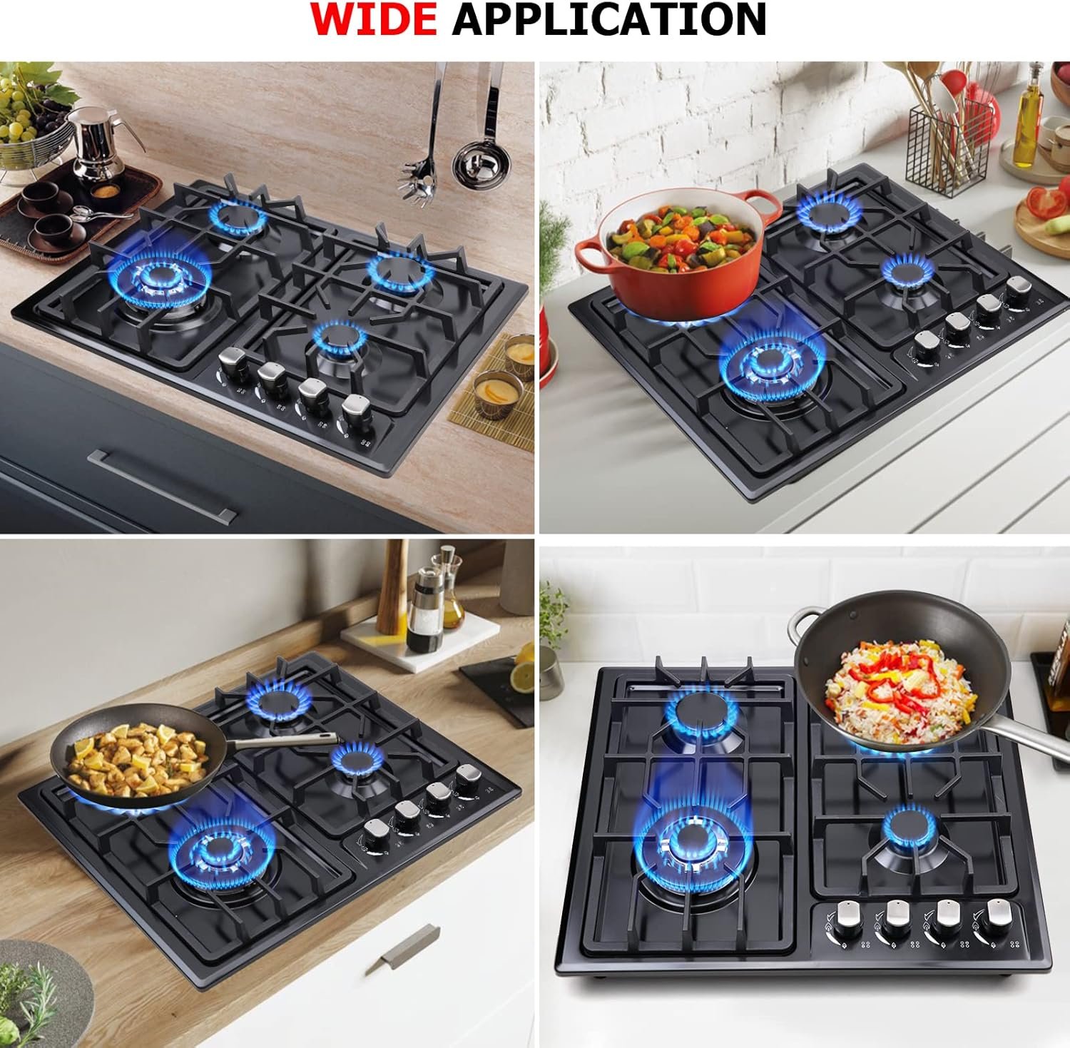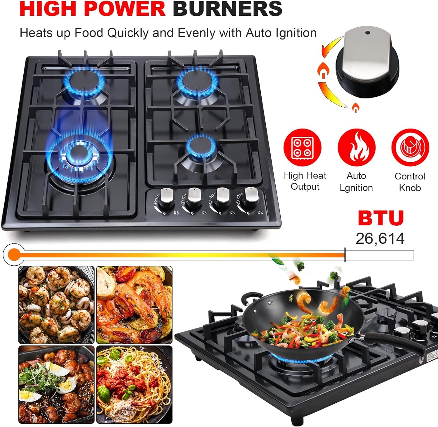 【HIGH POWER BURNERS】The built-in gas cooker with cutout size 22”W x 18 1/2”H, is ready for natural gas installation and includes an easy to use liquefied gas conversion kit. It has a safe electronic ignition system with ①one 130mm 3.3kW/11,260 BTU triple ring wok burner, ②two 75mm 1.75kW/5,971 BTU semi-rapid burners and ③one 55mm 1.0kW/3,412 BTU auxiliary burner with a total power of 26,614 BTU.