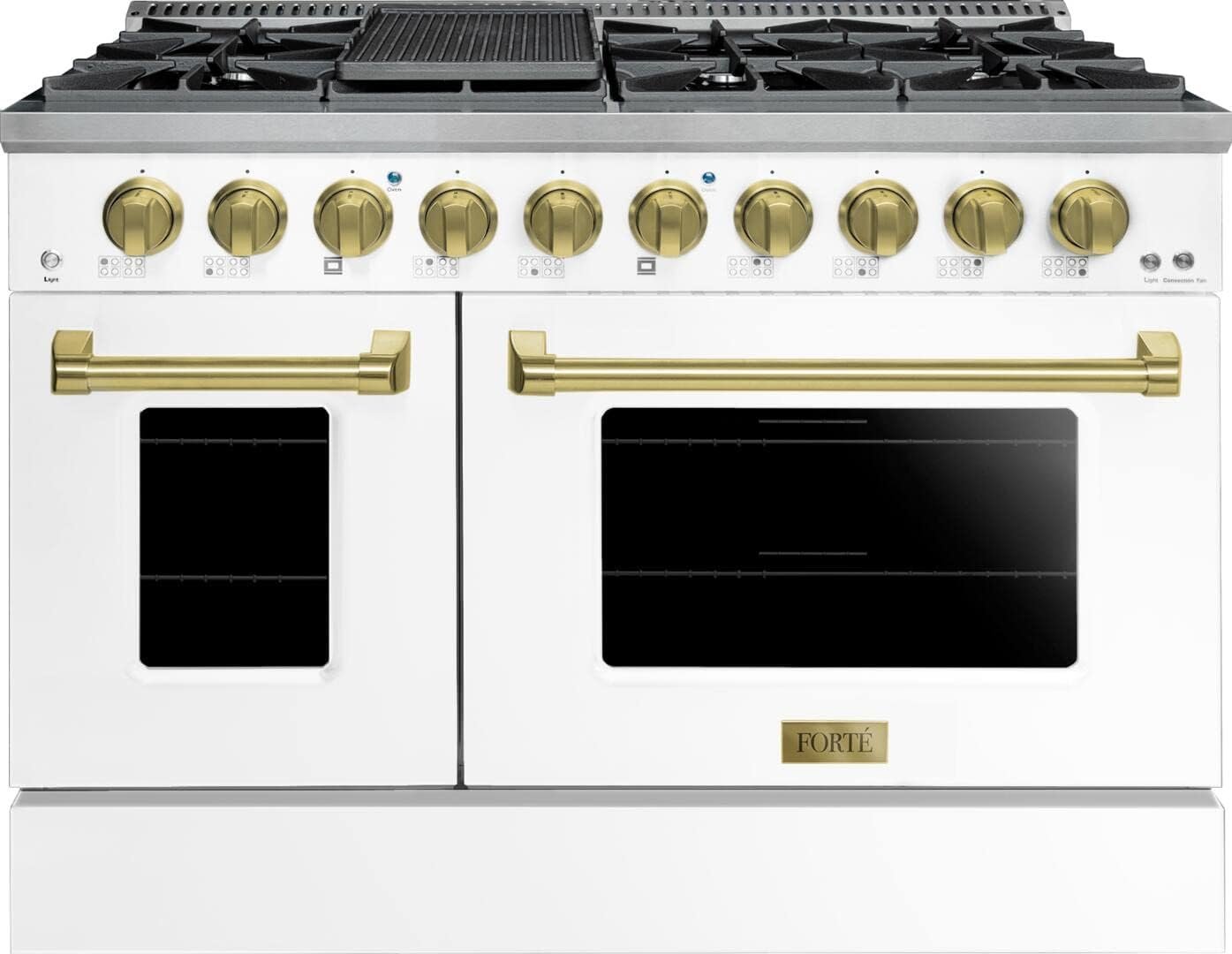 Forte FGR488BWWBR Overview The FGR488B 48″ Freestanding Gas Range by FortΓ© comes with 8 Sealed Italian Burners and 5.53 cu. ft. Dual Oven Total Capacity. It also features Edge to Edge Grates, Easy Glide Oven Racks, a 10K BTU Broiler and is LP Convertible.