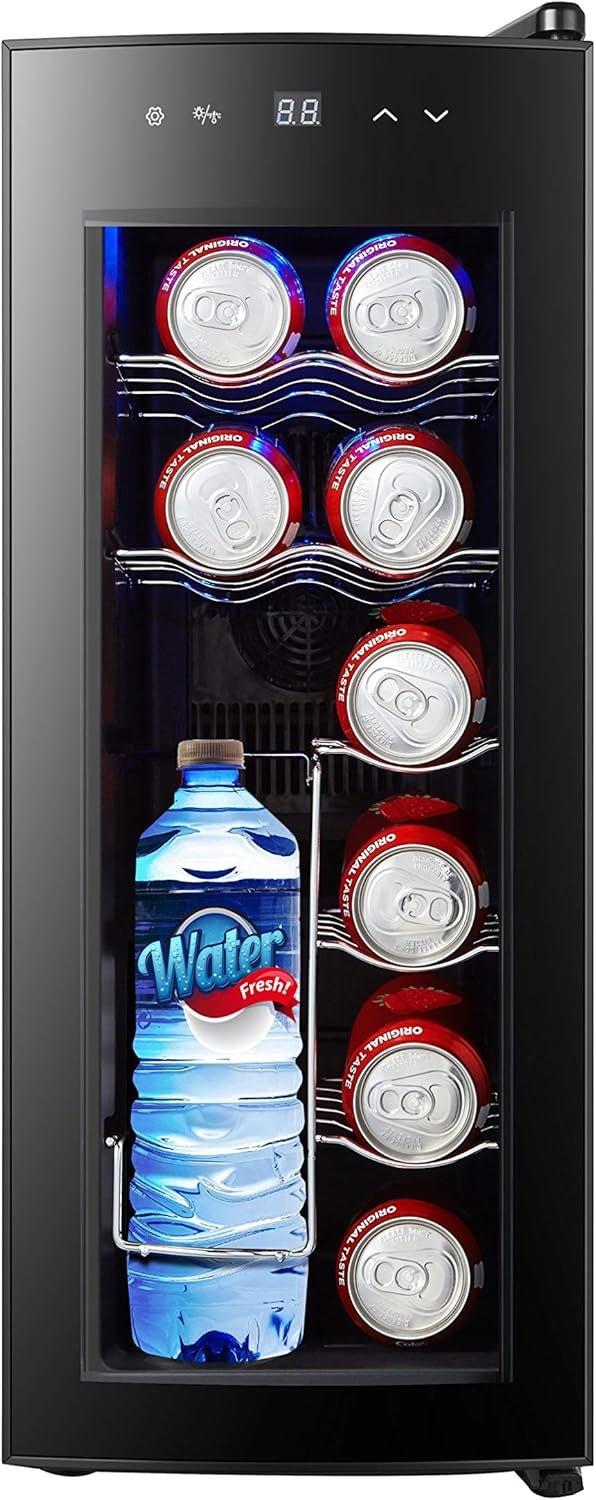 COMPACT & DECORATIVE DESIGN: The stylish curved glass door on this beverage cooler and blue interior light will look classy in almost any home. The light automatically comes on when the wine cooler door is opened