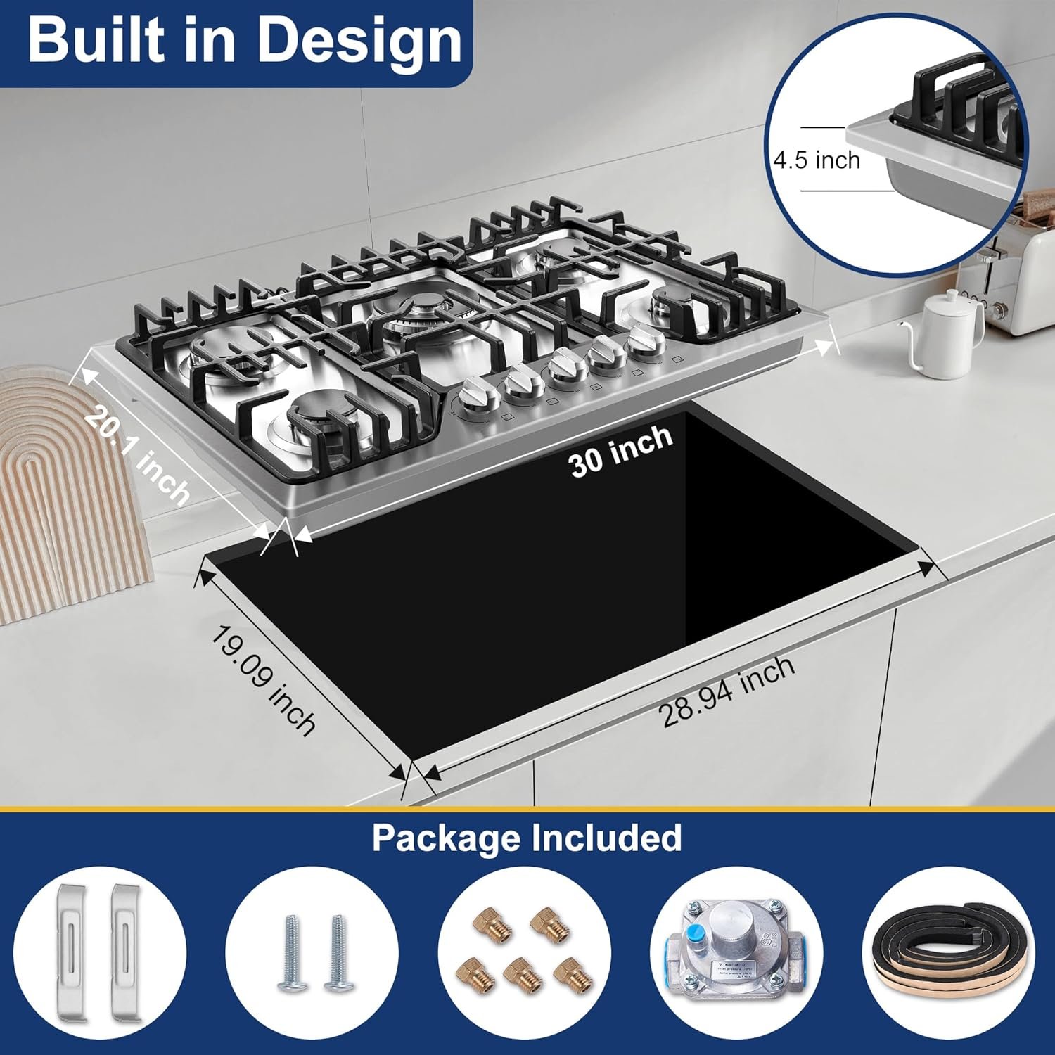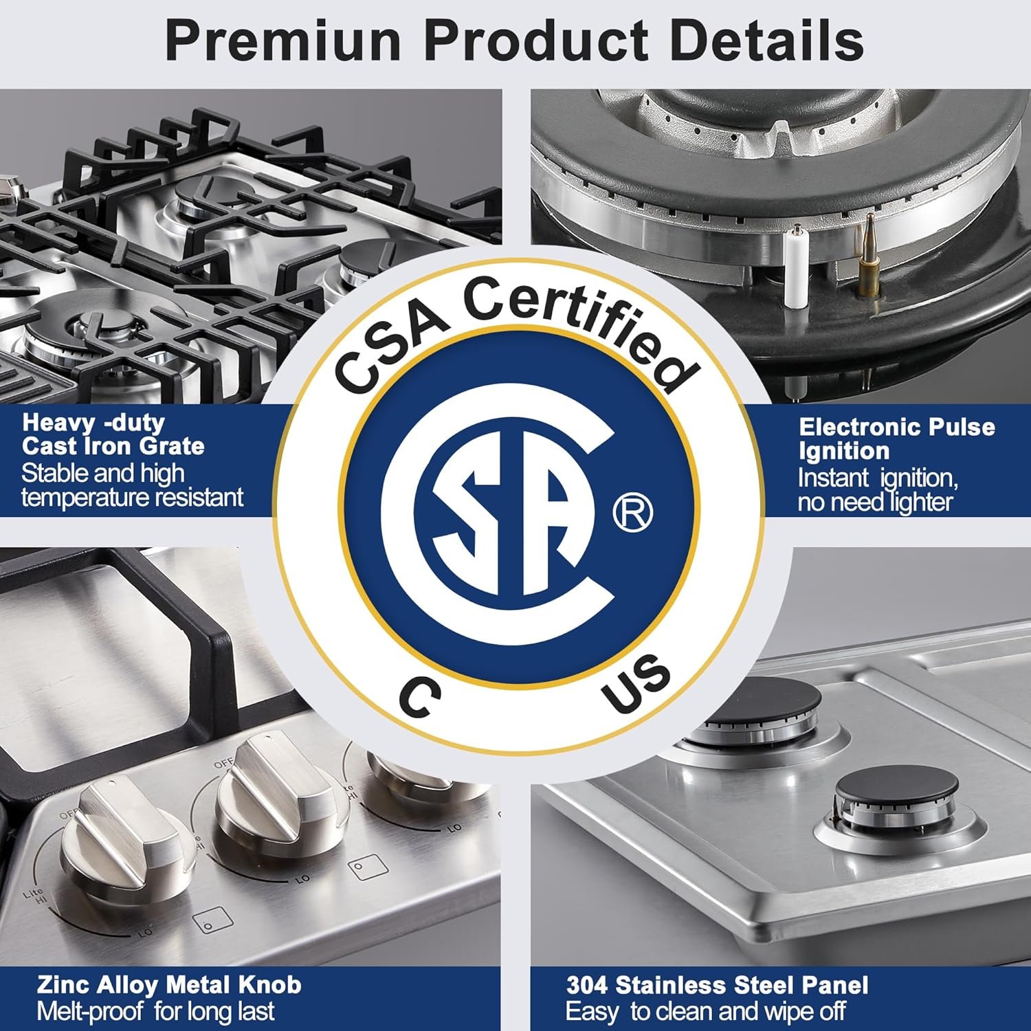 【Flame Failure Detection + CSA Certification】This 30 inch gas stove top is CSA certified for US and Canada use including a CSA certified gas pressure regulator. A safety device is installed in every burner unit, automatically cutting off the gas supply when the flame goes out and preventing gas leaks and potential fire hazard risks.
