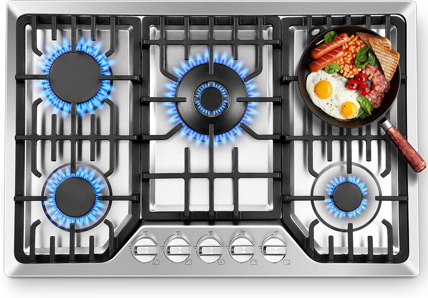 【Preium Quality & Easy to Clean】This 30 inch propane cooktop is built with 304 food-grade stainless steel surface and durable parts including edge to edge heavy cast iron grates and heat resistant metal knobs. 5 seamlessly sealed burners prevent food from dropping into them. You can simply remove the grates and wipe it clean with water or detergent. The automatic electric pulse ignition uses a 120V AC power(Come with 3.6FT cord plug), bring more convenience to your life.