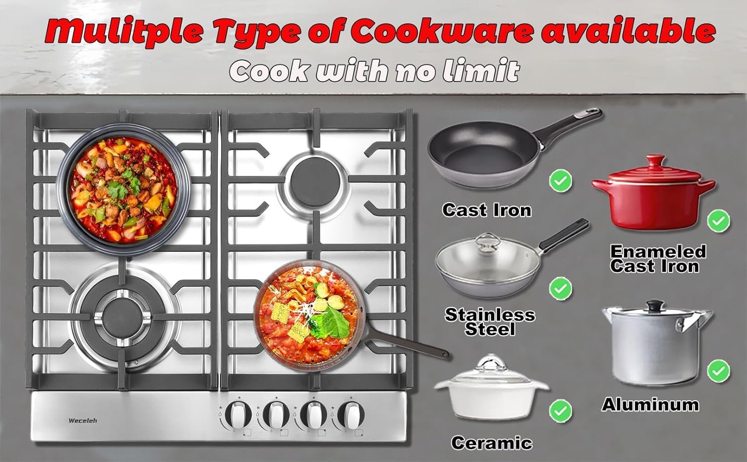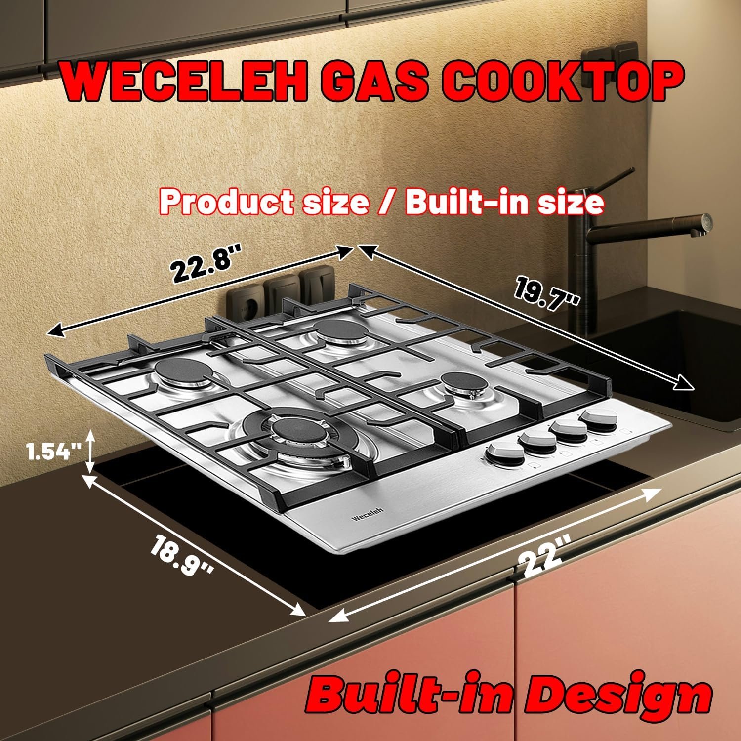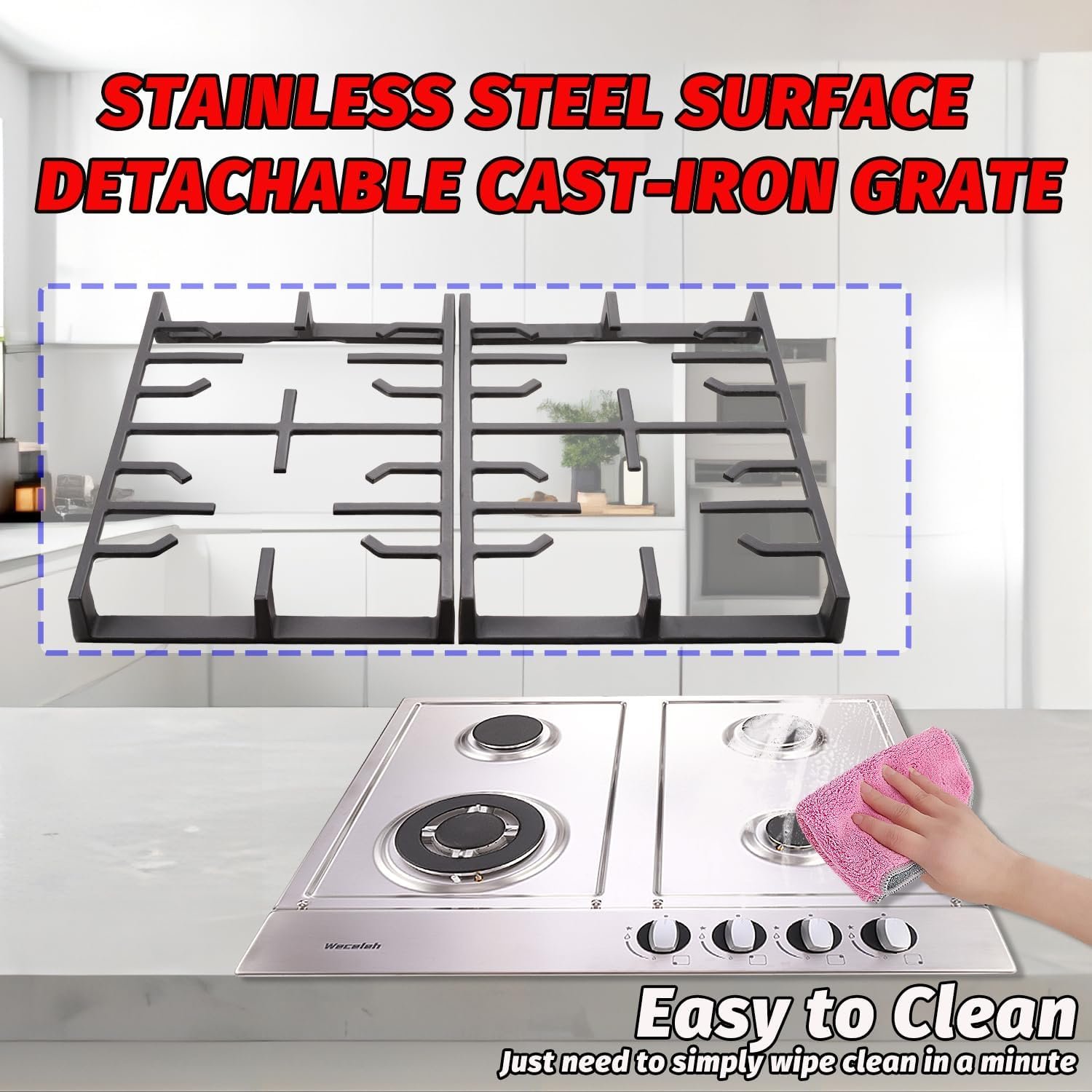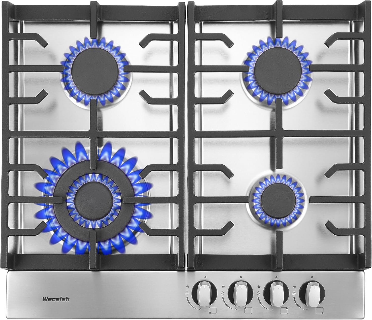 【Sturdy Construction & Thermocouple Protection】Weceleh 24 inch stainless steel gas stovetop has the heavy duty cast iron grate that is resistant to high temperatures and resists rusting, enhancing the beautiful appearance of the gas cooktop. If no flame is detected, the Thermocouple Flame Out Failure Detection (FFD) system will automatically shut off the gas.