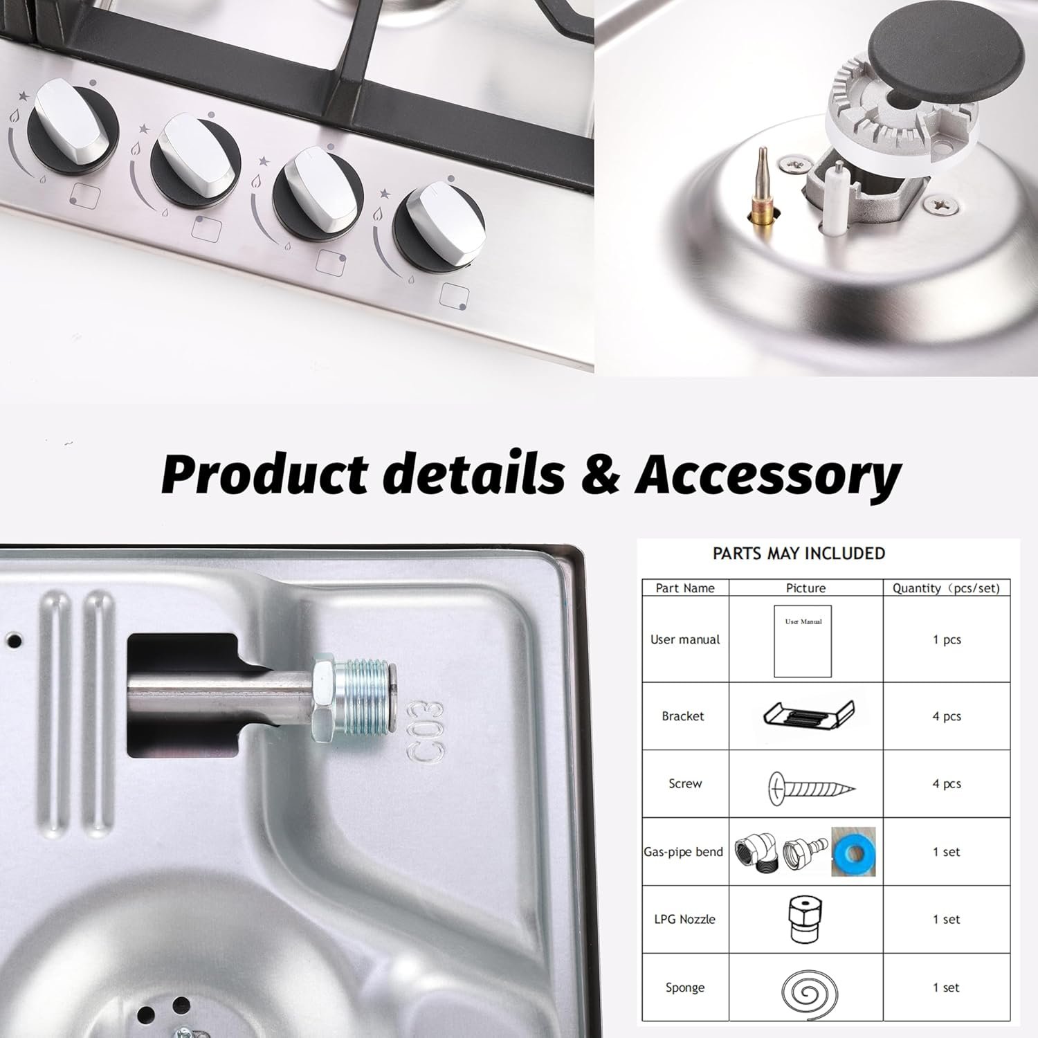 【Attention】 This Stainless Steel Built-in Gas Cooktop should be used in a ventilated place. Don’t use this Gas Stove Top on a wood table or on a tabletop with a tablecloth. This can cause high temperature and spontaneous combustion.