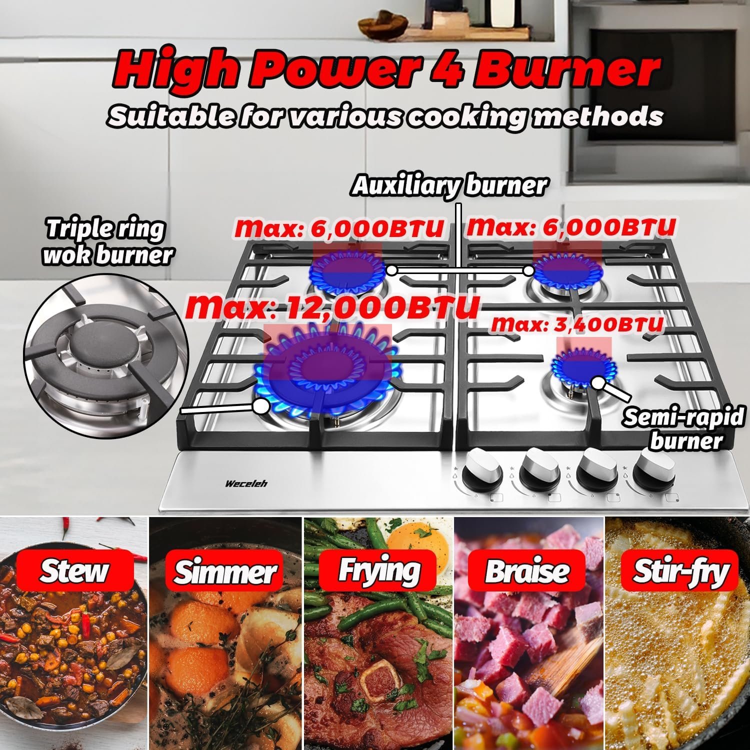 【4 Powerful Cooking Burners】Weceleh 24 inch gas cooktop features 4 high efficiency sealed burners. The 4 burners include a 12,000BTU trible ring burner, two 6,000BTU semi-rapid burners and a 3,400BTU auxiliary burner. High heat energy ensures fast cooking, whether you’re brewing tea, boiling water, making coffee, or cooking some everyday simple dishes, it handles them all with ease.