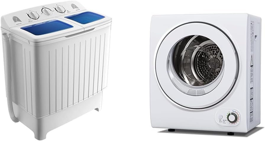 This space-saving bundle includes a Giantex 12lb washing machine and Euhomy 1.5cu ft clothes dryer, providing a complete portable laundry solution for apartments, RVs, dorms, and more. The Giantex washing machine features separate 12lb wash and 8lb spin tubs to clean clothes efficiently using 300W power. Its compact 25″L x 14″W x 28.5″H body has easy controls and rolls for convenient placement. Pair it with the equally compact 19.5″ x 15.7″ x 23.6″ Euhomy dryer that uses a powerful 850W heater to dry up to 10 lbs of wet laundry at a time. It has adjustable timed drying cycles, including special modes for drying delicate fabrics. The dryer’s large 105° door opening allows easy access, while its transparent window lets you monitor drying progress. With robust wash and dry capacities in small footprints, these machines are perfect companions for laundry in tight spaces. The Giantex efficiently washes clothes, then passes them to the Euhomy to dry wrinkle-free. Together they form an easy-to-use, apartment-sized laundry system.