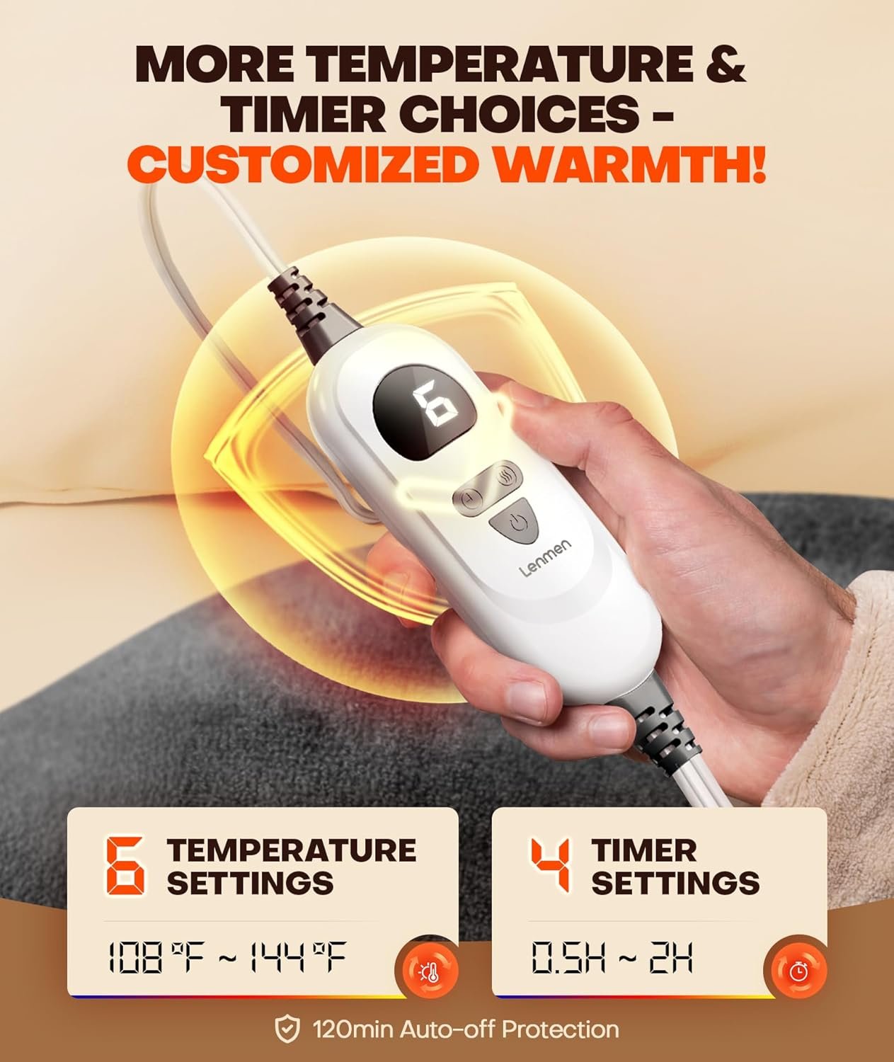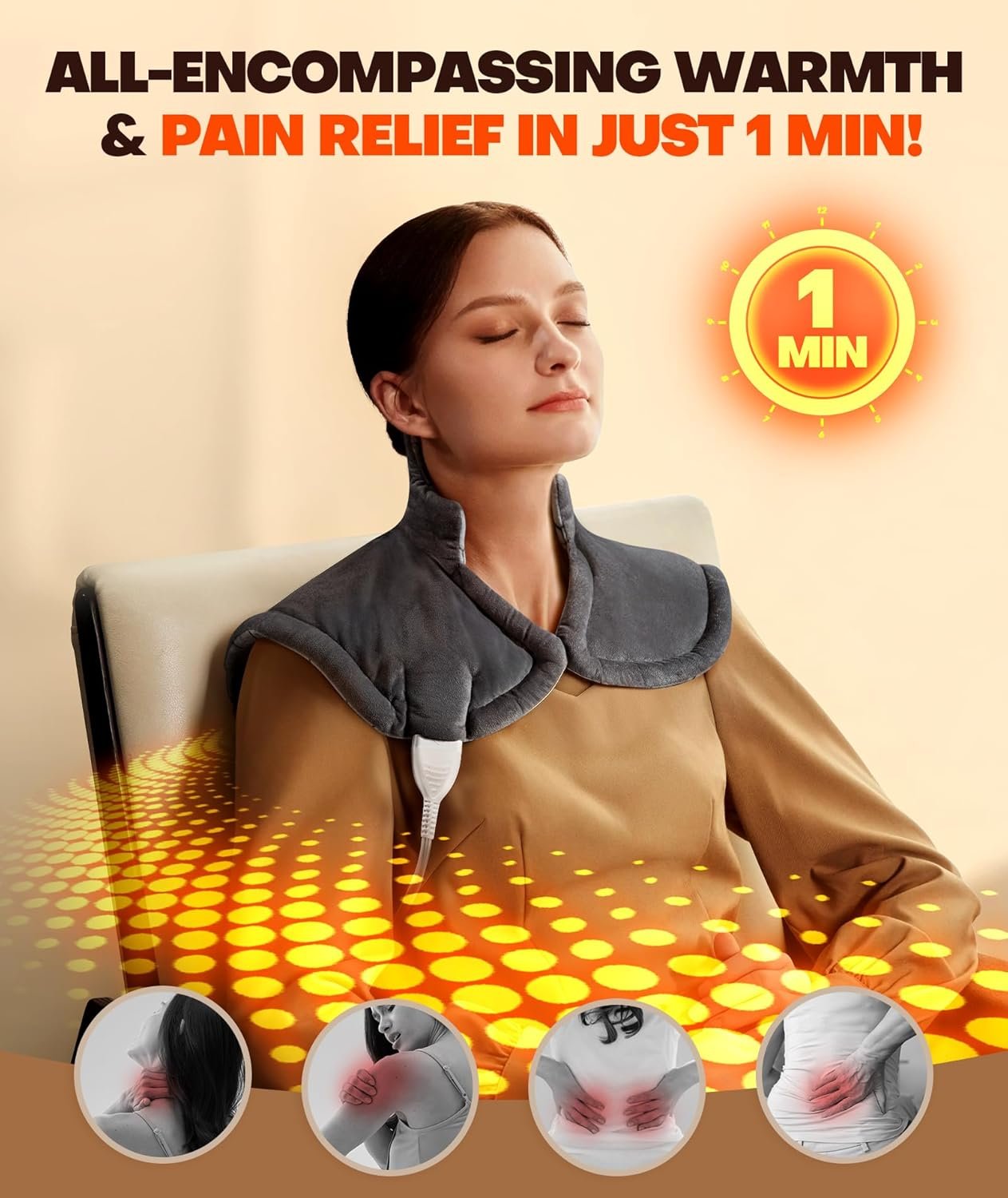 MORE HEAT & TIMER CHOICES TO CUSTOMIZED WARMTH! To better accommodate your demands, this neck and shoulder heating pad features 6 temperature settings(108℉ ~ 144℉) and 4 auto-off timer options (0.5 h ~ 2 h). You can easily tailor your preferred warm mode with the LED controller. The neck heater is big enough to cater to most body shapes and sizes. The micro plush flannel fabric has a luxurious and soft feel and is machine-washable after removing the controller, cleaning will be a breeze!