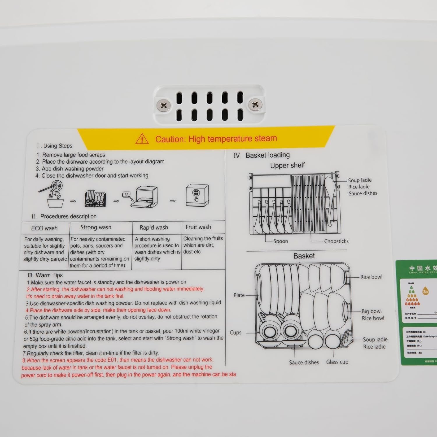 Notes1. Please note that this product does not include other items such as dishes. Please carefully read the label on the product and pay attention to the precautions included before use.2. During use, please do not place your hands near the air outlet to avoid high-temperature burns. Please make sure the distance between your product and the wall is more than 19.6″.3. Please note that unclean washing caused by size issues, inaccurate installation, utensils size and placement issues, improper use of detergents, human damage, and other issues is not a quality issue of the machine.4. After washing, the dishwasher automatically enters the drying mode. If you do not need to use the tableware immediately, it is recommended not to open the door to pick up the tableware. Improper placement of tableware can lead to water accumulation. Please ensure proper placement. After the entire program is completed, it is recommended to remove the tableware to prevent secondary condensation of water vapor inside the machine. After washing, it is a normal physical phenomenon for water droplets to appear on the inner wall of the machine.5. Please choose the correct procedure. For severe stains, strong washing should be chosen. Please place the tableware correctly and leave a certain gap between the tableware. Please use an appropriate amount of cleaning agent according to the procedure to ensure sufficient decomposition of oil stains, and please do not add too much.6. Please note that each dishwasher undergoes water ingress testing during production to ensure that the product is qualified. Therefore, when opening the dishwasher, there may be water droplets inside, and there may be a small amount of condensation or mist on the body, which is normal and does not affect product performance.7. Please allow the slight color difference caused by the shooting light and the 1-3 cm error due to manual measurement, and make sure you do not mind before ordering.